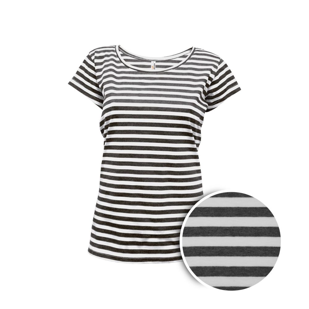 Maglietta da donna a righe bianche e nere con maniche corte, rifinita con collo bianco. Materiale: 60% cotone e 40% poliestere, trattamento siliconico, piacevole al tatto. Ulteriori informazioni