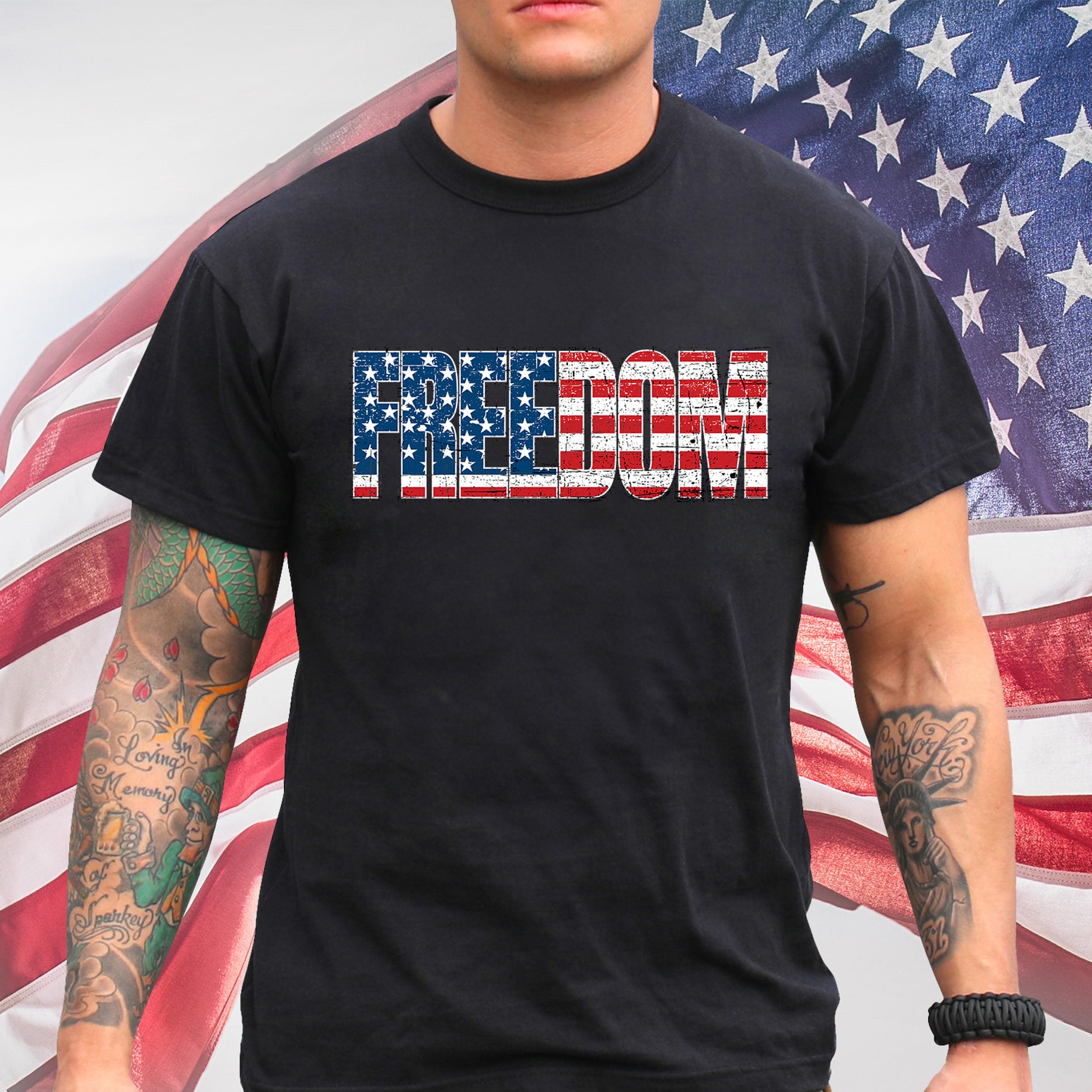 Comoda maglietta realizzata in cotone molto piacevole al tatto e traspirante. La struttura della maglietta presenta cuciture rinforzate. Sulla parte anteriore della maglietta è riportata la scritta FREEDOM (libertà).