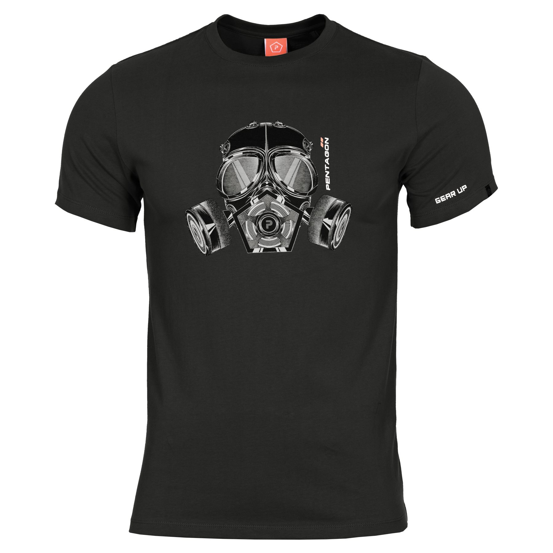 Maglietta leggera in cotone con motivo maschera antigas nera del marchio PENTAGON. La maglietta è realizzata in materiale elastico ad asciugatura rapida con un trattamento che impedisce la formazione di odori sgradevoli.