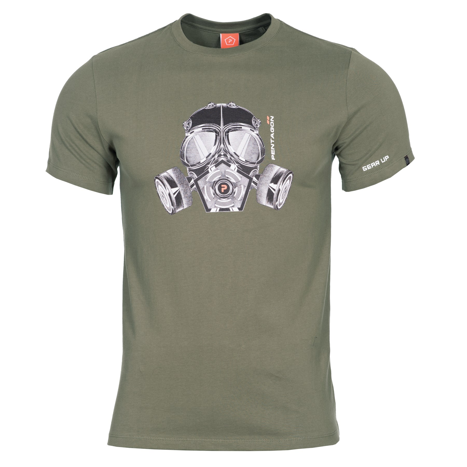 Maglietta leggera in cotone con motivo maschera antigas nera del marchio PENTAGON. La maglietta è realizzata in materiale elastico ad asciugatura rapida con un trattamento che impedisce la formazione di odori sgradevoli.