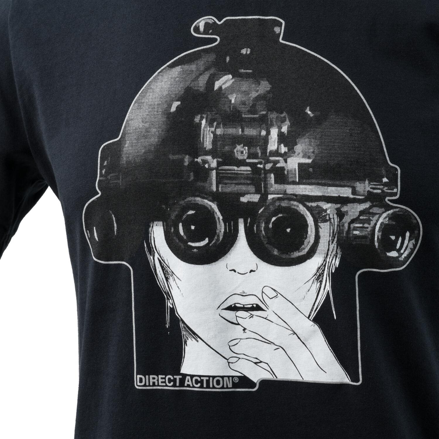 Comoda maglietta dal taglio classico con il logo del marchio DIRECT ACTION e l'immagine di una donna con elmetto e visore notturno. La maglietta è realizzata in cotone al 100%.