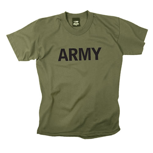 Maglietta per bambini di colore verde oliva con la scritta ARMY. Materiale: 60% cotone, 40% poliestere.