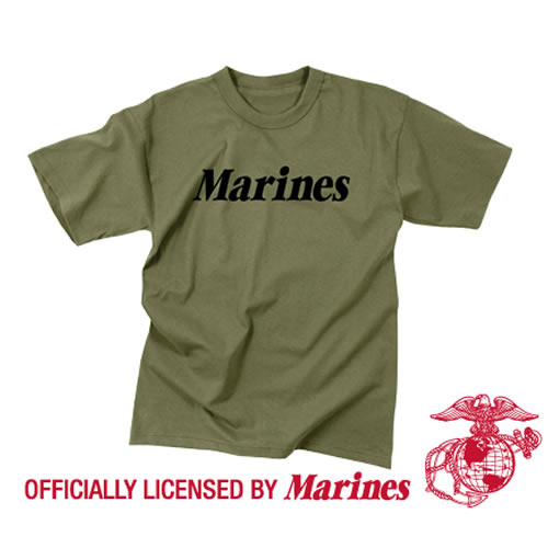 Maglietta per bambini di colore verde oliva con la scritta Marines. Licenza ufficiale USMC. Materiale: 60% cotone, 40% poliestere.