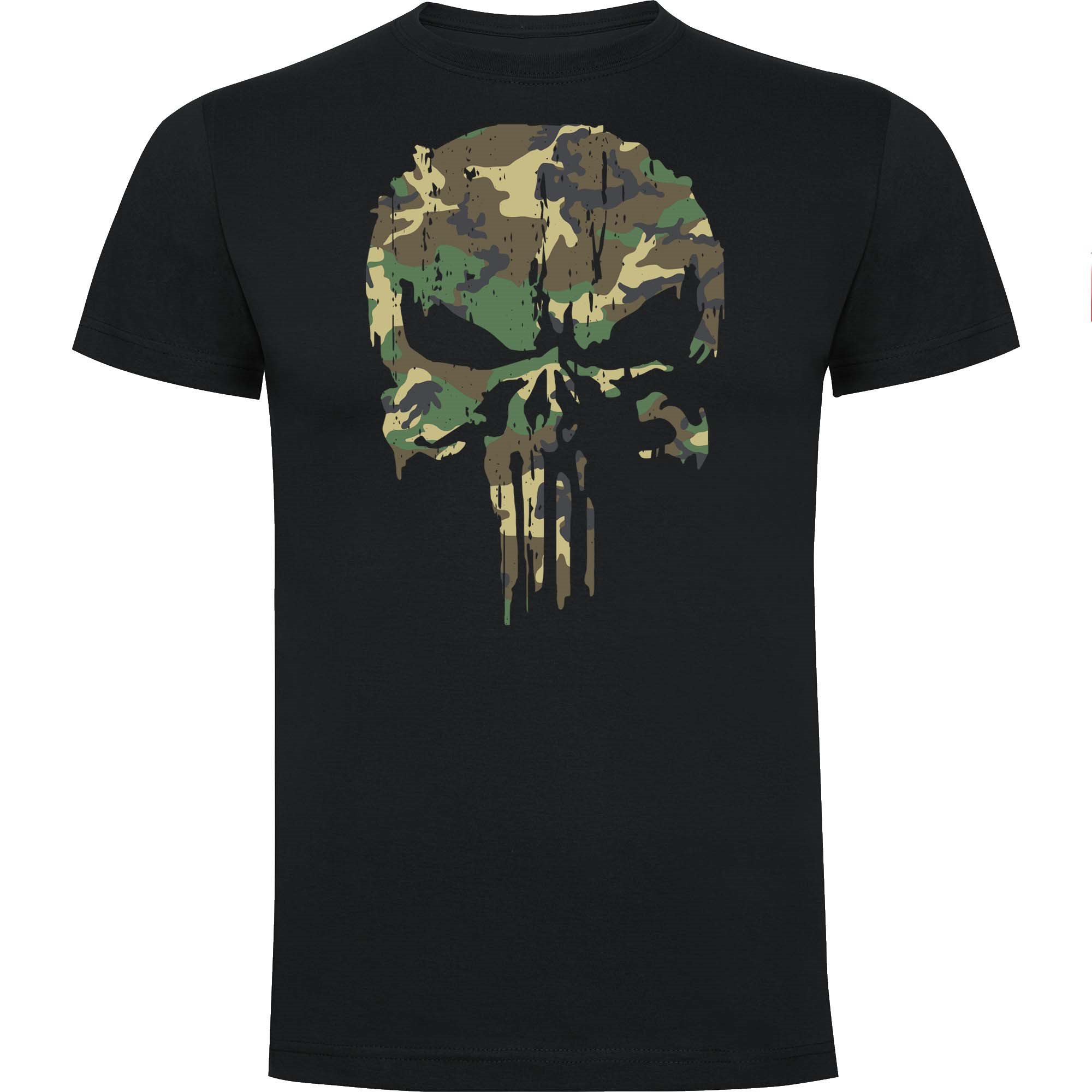 Maglietta di alta qualità con maniche corte e stampa di teschi in stile mimetico americano woodland.
