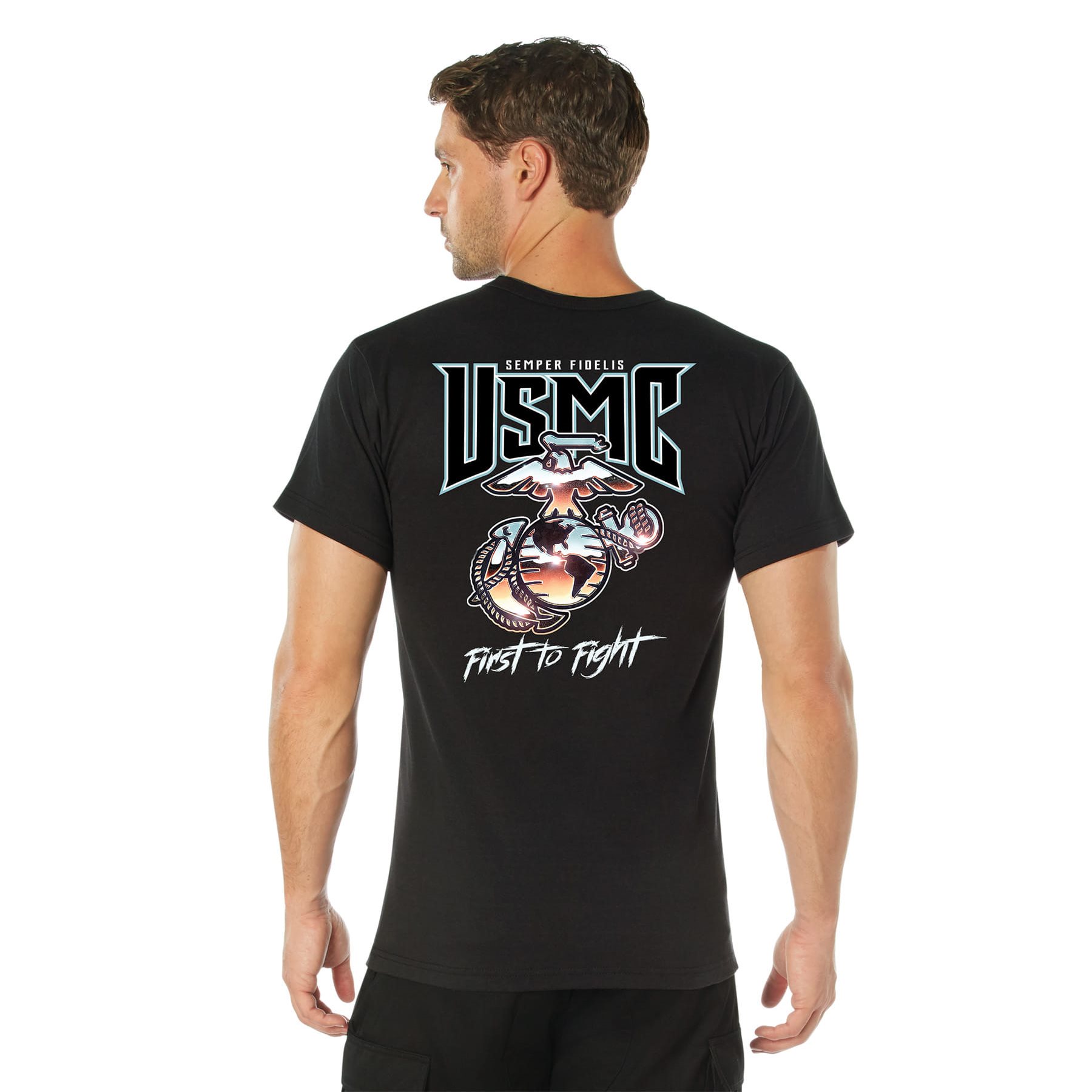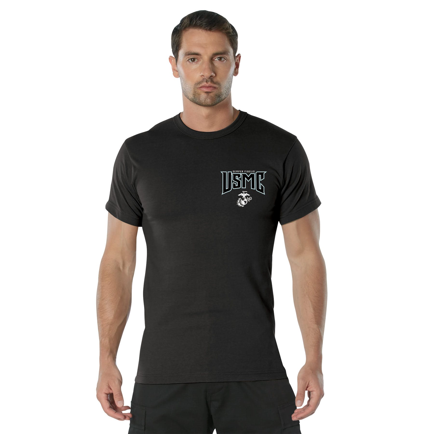 Maglietta con licenza USMC (Marina degli Stati Uniti d'America) realizzata in cotone molto piacevole al tatto e traspirante. La struttura della maglietta presenta cuciture rinforzate. Sulla parte anteriore è presente il logo USMC, mentre sulla parte posteriore è presente il logo abbinato alla scritta SEMPER FIDELIS (sempre fedele) e FIRST TO FIGHT (primi in battaglia).