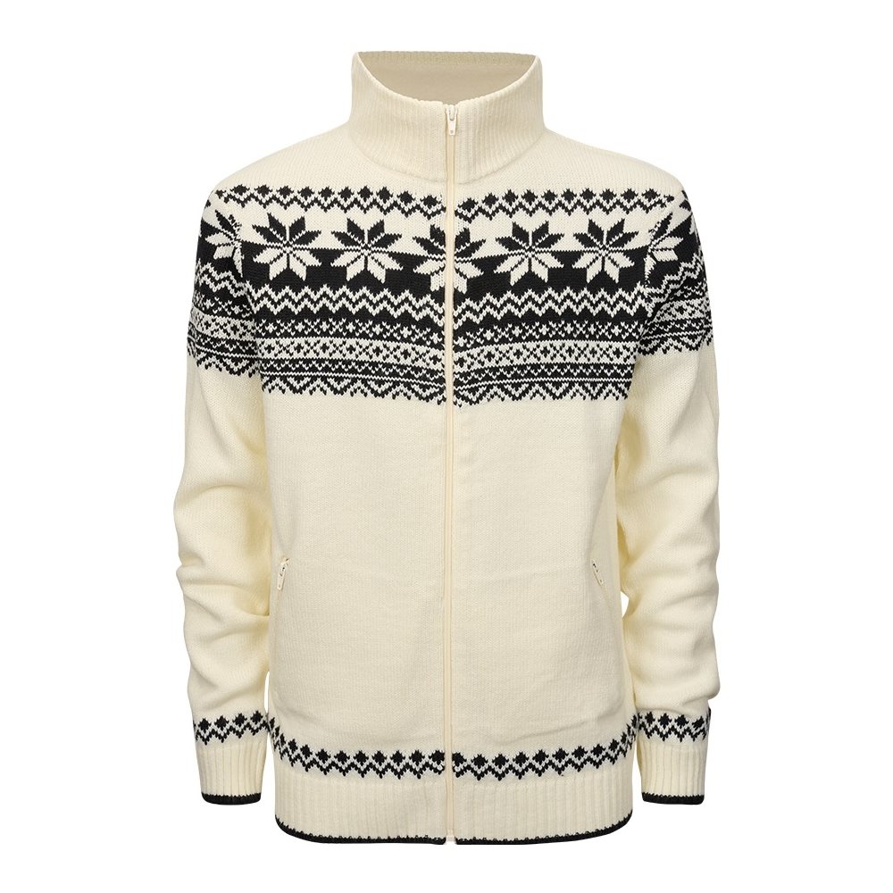Maglione elegante dal classico look scandinavo. Il maglione è realizzato in materiale caldo e morbido al tatto, con morbida fodera in pile nella zona del collo. Chiusura con lunga cerniera metallica. Tasche con chiusura a zip. Maniche, orlo inferiore e collo del maglione rifiniti con maglia elastica.