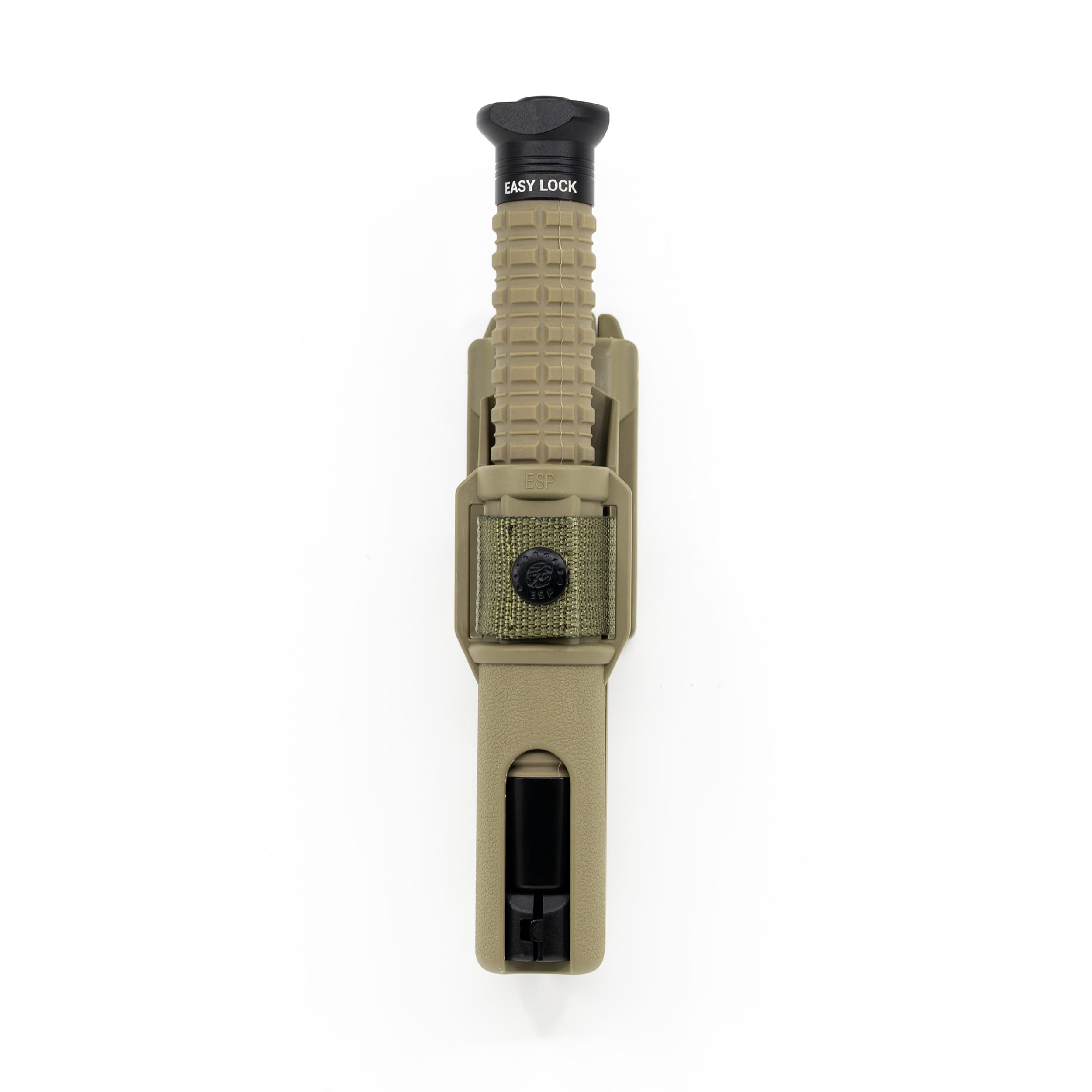 Durante i test di caduta, il manganello è stato fatto cadere da 2 m su cemento (la direttiva tedesca richiede il legno, che è una superficie più morbida) e si è chiuso senza problemi. Abbiamo aperto e chiuso il manganello 6.000 volte e il meccanismo di blocco ha continuato a funzionare. La qualità del meccanismo di blocco è stata verificata anche da ripetute cadute del manganello nel fango.