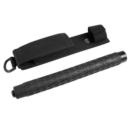 Manganello telescopico non temperato. Impugnatura in gomma antiscivolo. Design completamente nero. Lunghezza 56 cm. Fornito con custodia in nylon da agganciare alla cintura.