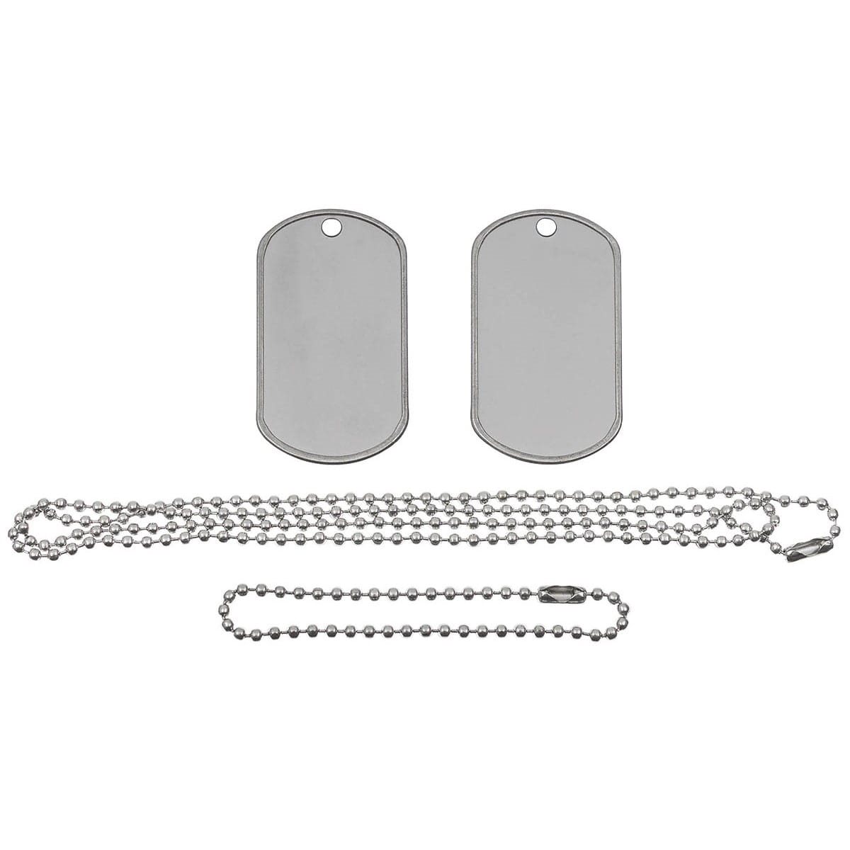 Set di piastrine di identificazione (dog tags), comprese le catene. Contiene due piastrine in acciaio inossidabile e due catene nichelate (una lunga e una corta).