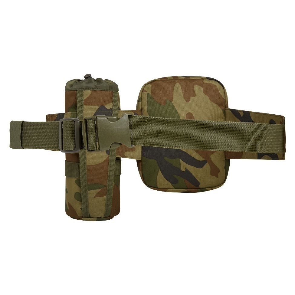 Resistente marsupio combinato con cintura tattica e custodia per bottiglia. Tutti e tre i prodotti sono realizzati in poliestere 600D, che offre un ottimo rapporto tra resistenza e leggerezza.