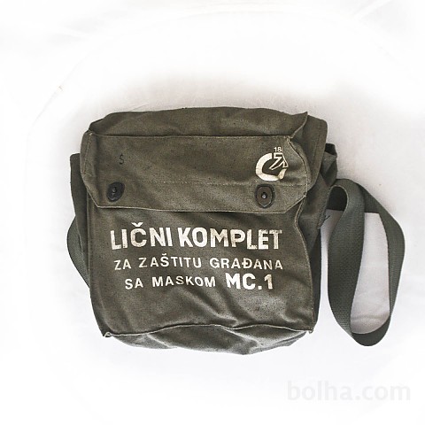 Maschera antigas croata (jugoslava) comprensiva di filtro e telo protettivo/impermeabile. Il tutto è contenuto in una borsa a tracolla in tela. Senza garanzia di funzionamento, solo per scopi decorativi. Ulteriori informazioni