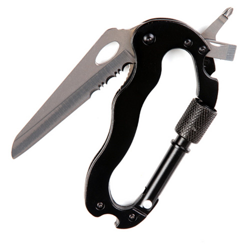Moschettone dotato di pratici utensili: coltello con lama parzialmente seghettata (combinata), cacciavite a croce, cacciavite piatto, apribottiglie. Lunghezza: circa 100 mm. Materiale: metallo. Ulteriori informazioni
