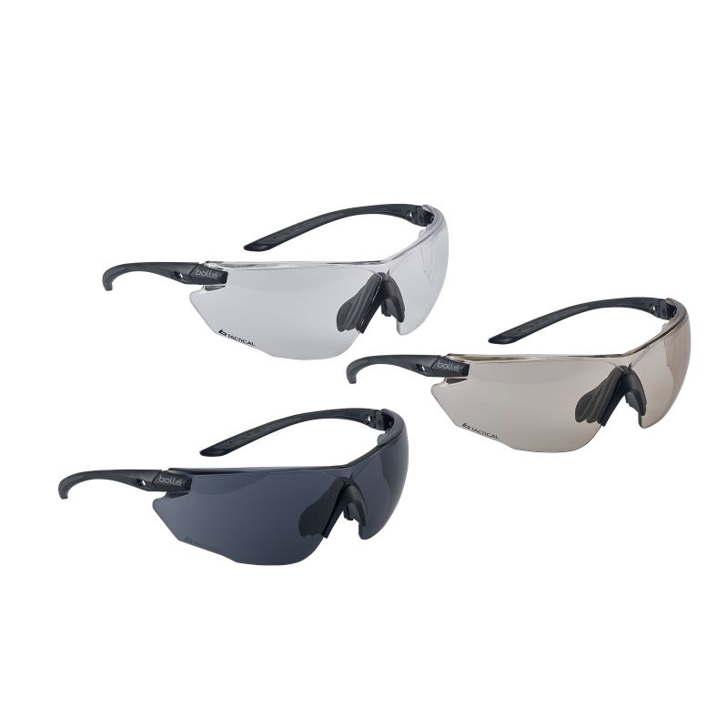 Occhiali protettivi balistici Bolle Combat con tre lenti intercambiabili, conformi sia alla norma civile EN 166 per i dispositivi di protezione, sia alla norma militare NATO STANAG 4296 per la resistenza balistica.