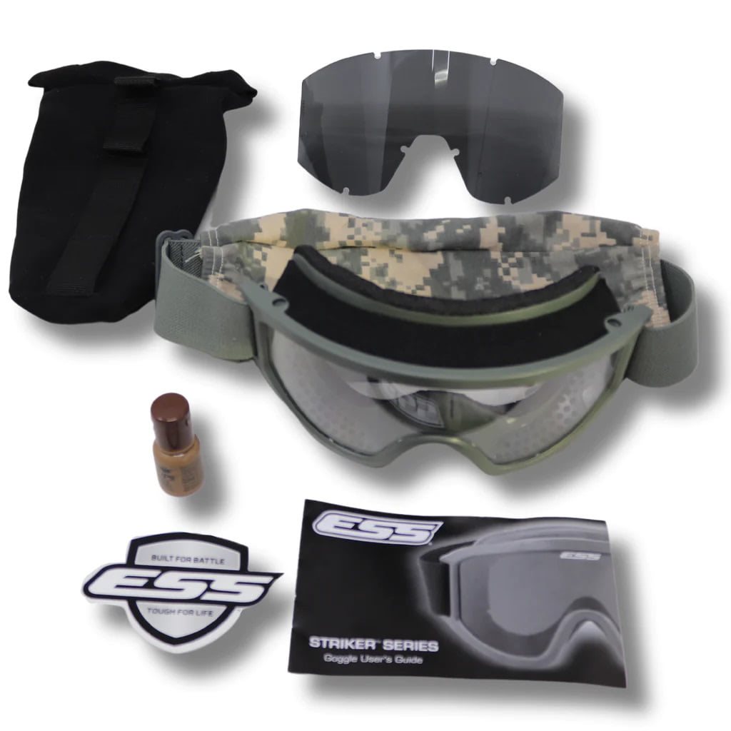 La fascia di fissaggio degli occhiali consente di indossarli o toglierli rapidamente e, per un maggiore comfort, sono dotati di una morbida imbottitura. La montatura è completamente ventilata e aumenta così la protezione dall'appannamento. Un piacevole vantaggio è la possibilità di utilizzarli con normali occhiali da vista. Forniti con custodia protettiva in mimetico ACU, lenti fumé e lenti trasparenti e custodia in nylon.