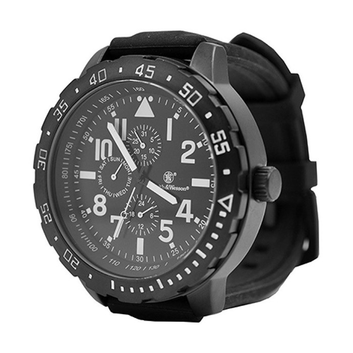 Orologio di alta qualità del rinomato marchio Smith & Wesson, denominato CALIBRATOR. L'orologio, di dimensioni piuttosto grandi, è realizzato in acciaio inossidabile nero con numeri bianchi e funziona grazie a un preciso movimento al quarzo giapponese. I piccoli quadranti indicano la data e il giorno della settimana (abbreviazioni inglesi). Il vetro minerale temperato resiste ai graffi durante l'uso normale. Il vetro minerale temprato resiste ai graffi durante il normale utilizzo. Gli orologi sono impermeabili fino a 50 M, il che li rende un accessorio adatto per tutti gli avventurieri e i turisti, e sono apprezzati anche dalle forze armate. Il cinturino in gomma, molto confortevole, è cucito con filo bianco.