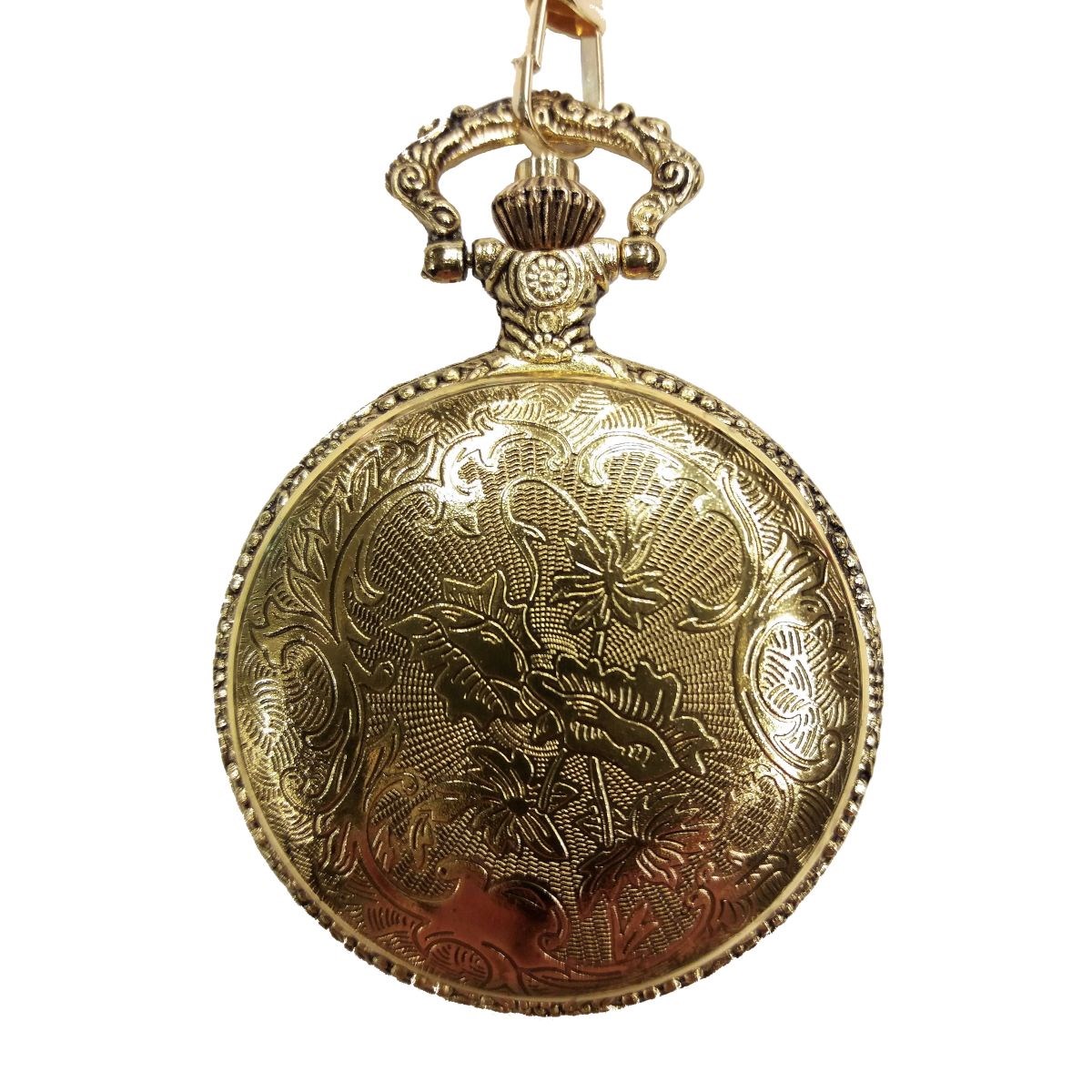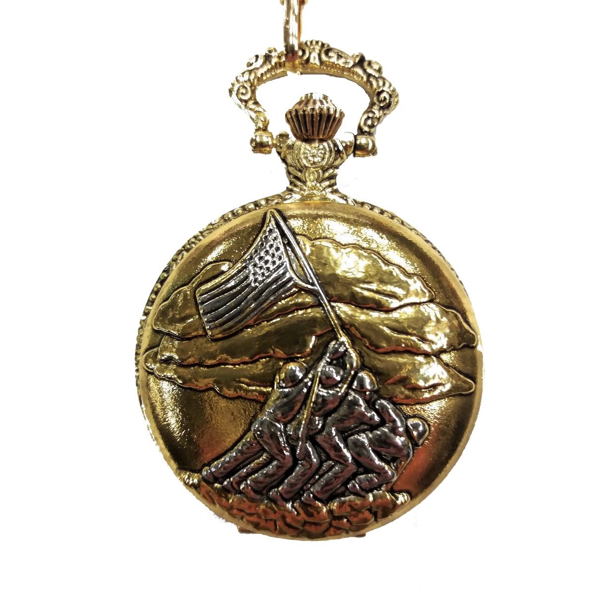 Orologio da tasca decorato con catena e motivo della Seconda Guerra Mondiale. Sul coperchio dell'orologio è raffigurato, su sfondo dorato, il simbolo argentato di Iwo Jima: soldati americani che issano la bandiera degli Stati Uniti (replica della foto di Joe Rosenthal, una delle più famose fotografie della Seconda Guerra Mondiale). Sul quadrante dell'orologio è riportata la scritta WORLD WAR II, con l'anno 1939-1946 (gli Stati Uniti indicano l'anno 1946, quando Sul quadrante dell'orologio è riportata la scritta WORLD WAR II, l'anno 1939-1946 (gli Stati Uniti indicano il 1946 come anno di fine della smobilitazione) e due aerei. L'orologio è in stile retrò, con lancette e numeri in linea con questo stile.