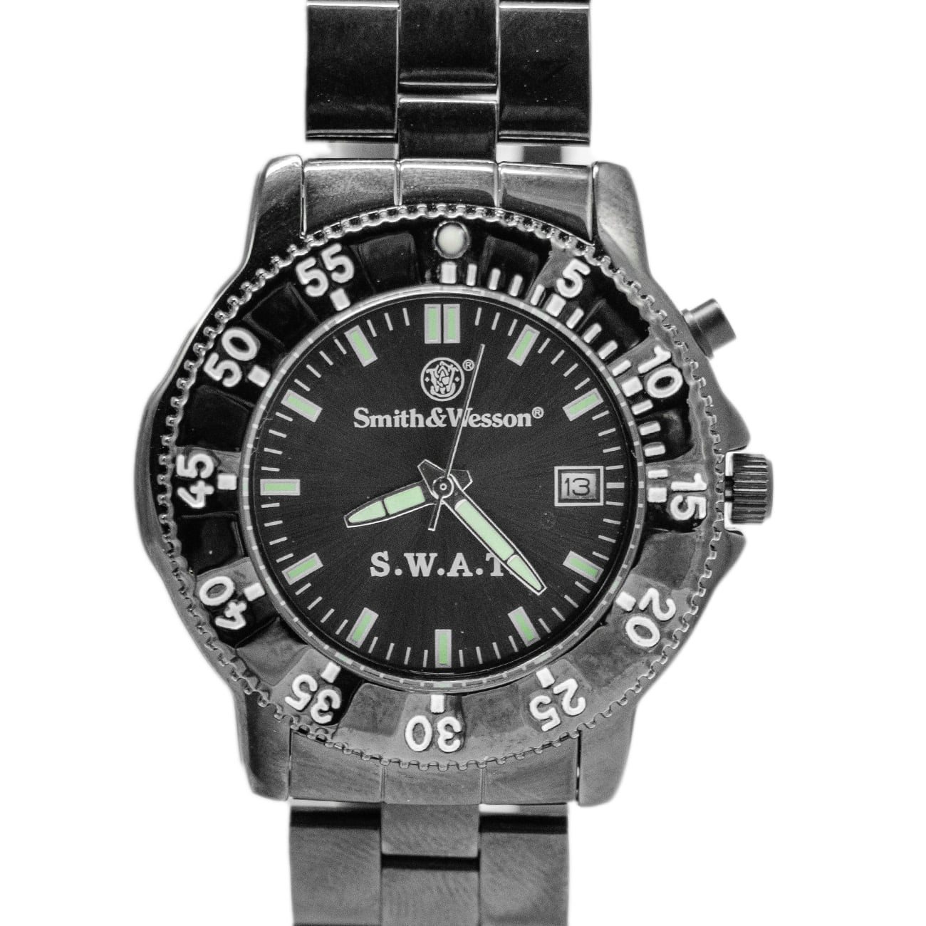 Orologio SWAT del marchio Smith & Wesson. È dotato di un preciso movimento al quarzo giapponese. Lancette e quadrante fluorescenti. Il corpo è in acciaio inossidabile per una maggiore resistenza, il vetro temperato di copertura ha una maggiore resistenza ai graffi. Impermeabilità 30M (resistono alla pioggia leggera, ma non alla doccia, ecc.).