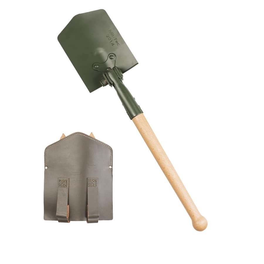 Pala pieghevole militare BW - predecessore dell'attuale modello in tre pezzi • molto stabile e facile da maneggiare • con manico in legno • con custodia in pelle per cintura • lunghezza da chiusa: 45 cm • peso: circa 1,5 kg