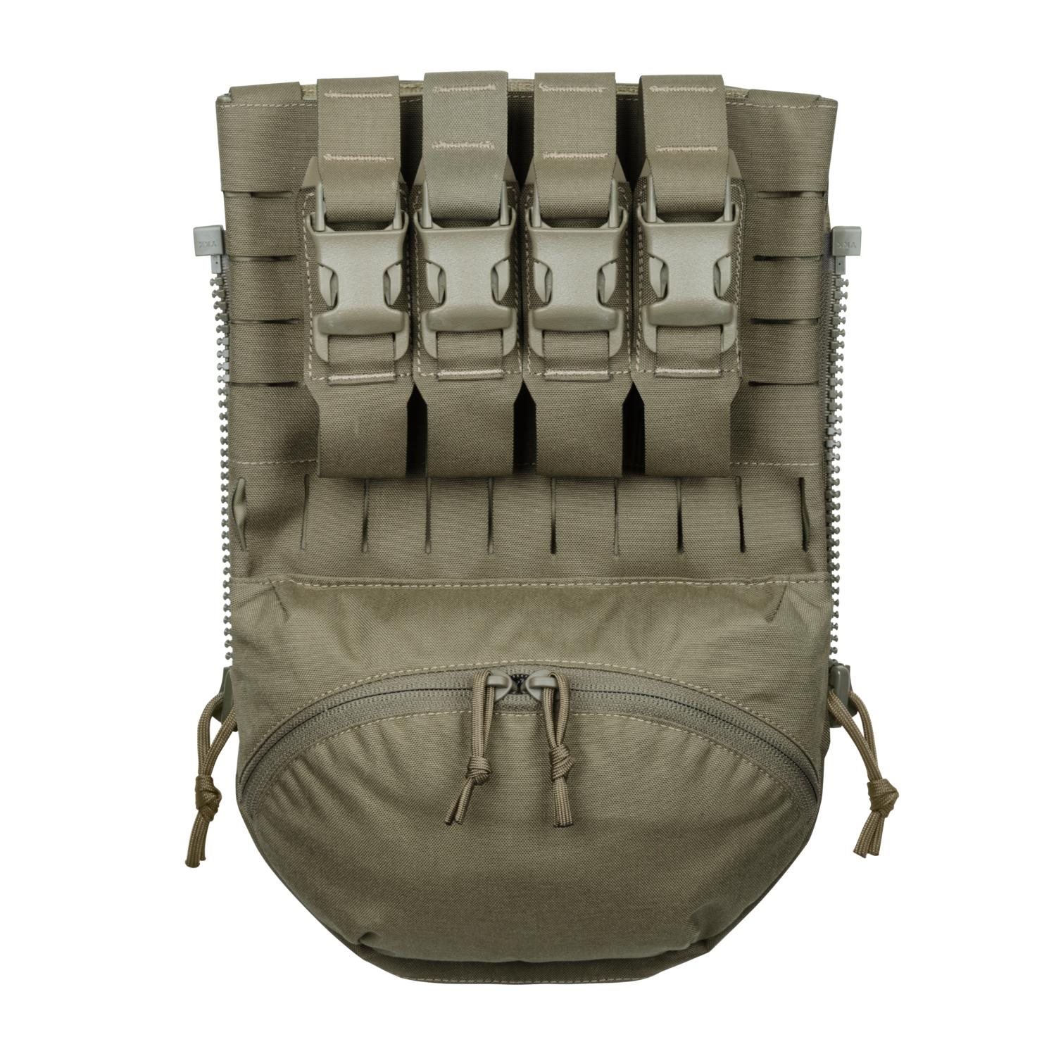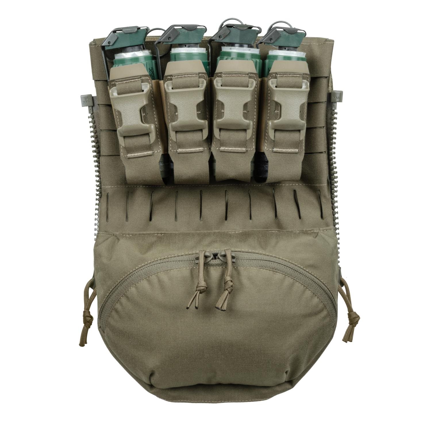 Pannello tattico posteriore progettato per l'integrazione nei supporti per piastre SPITFIRE® MK I e MK II o negli zaini HALIFAX® del marchio DIRECT ACTION. Il pannello è realizzato in una combinazione di laminato, nylon Cordura 500D e nylon 210D. La parte superiore del pannello è dotata di quattro tasche destinate allo stoccaggio di granate flash. Intorno alle tasche si trova un sistema di aggancio modulare standard MOLLE/PALS per la possibilità di espansione con attrezzature compatibili. La parte inferiore del pannello è costituita da una tasca relativamente capiente chiusa da una cerniera a doppio cursore. È foderata con morbido pile ed è quindi adatta per trasportare attrezzature più delicate come visori notturni, binocoli, ecc. L'ultimo vano portaoggetti si trova dietro il sistema di aggancio modulare. È adatto per riporre una sacca idrica o altra attrezzatura tattica.