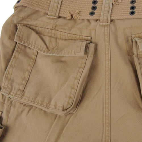 Leggeri pantaloncini cargo estivi realizzati in resistente cotone in stile vintage. I pantaloncini presentano un taglio ampio e comodo, chiusura classica con cerniera e bottone, ampio spazio di stivaggio e cintura di alta qualità. I pantaloncini sono dotati di numerose tasche. Le tasche anteriori sono oblique e sufficientemente profonde per contenere un portafoglio o uno smartphone. Sotto di esse si trovano le tipiche tasche cargo Brandit chiuse con patta e bottoni a pressione. Sotto la tasca cargo sinistra si trovano due piccole tasche adatte a contenere piccoli oggetti. Sotto la tasca cargo destra si trova una tasca piatta più piccola chiusa con cerniera. Il retro dei pantaloncini è dominato da due tasche più capienti, protette da una patta con bottoni automatici per evitare la caduta del contenuto. Per migliorare il comfort, l'orlo inferiore delle gambe può essere stretto con dei lacci.