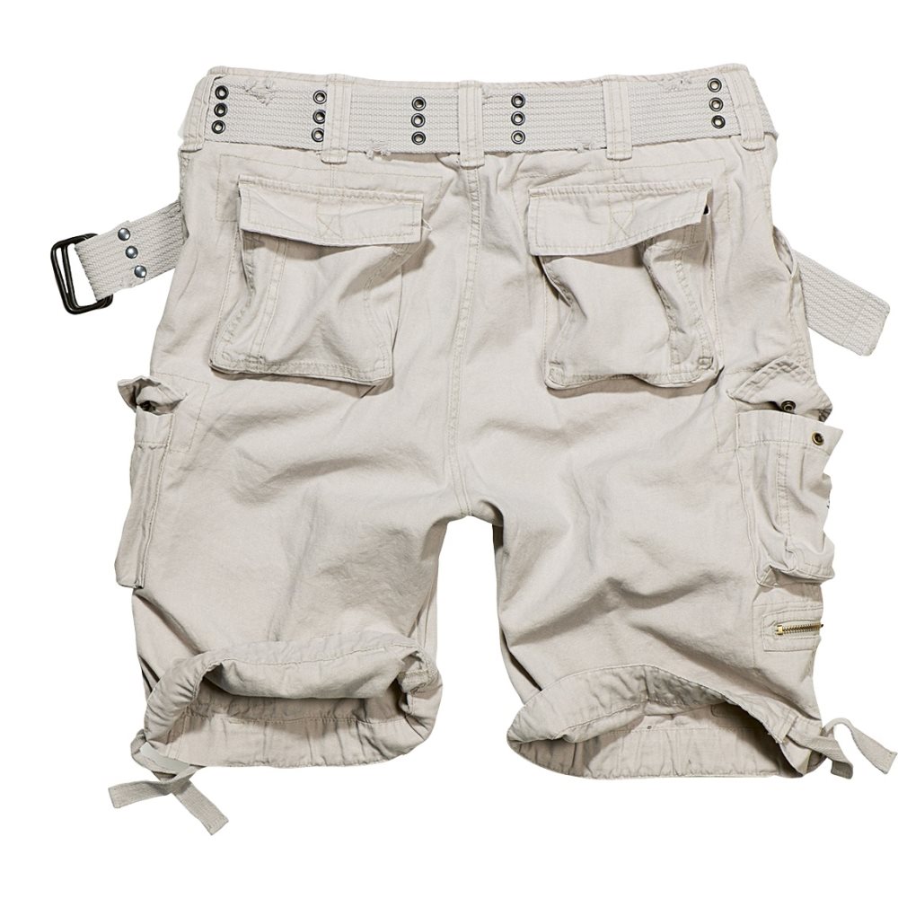 Leggeri pantaloncini cargo estivi realizzati in resistente cotone in stile vintage. I pantaloncini presentano un taglio ampio e comodo, chiusura classica con cerniera e bottone, ampio spazio di stivaggio e cintura di alta qualità. I pantaloncini sono dotati di numerose tasche. Le tasche anteriori sono oblique e sufficientemente profonde per contenere un portafoglio o uno smartphone. Sotto di esse si trovano le tipiche tasche cargo Brandit chiuse con patta e bottoni automatici. Sotto la tasca cargo sinistra si trovano due piccole tasche adatte per riporre piccoli oggetti. Sotto la tasca cargo destra si trova una tasca piatta più piccola chiusa con cerniera. Il retro dei pantaloncini è dominato da due tasche più capienti, protette da una patta con bottoni automatici per evitare la caduta del contenuto. Per migliorare il comfort, l'orlo inferiore delle gambe può essere stretto con dei lacci.