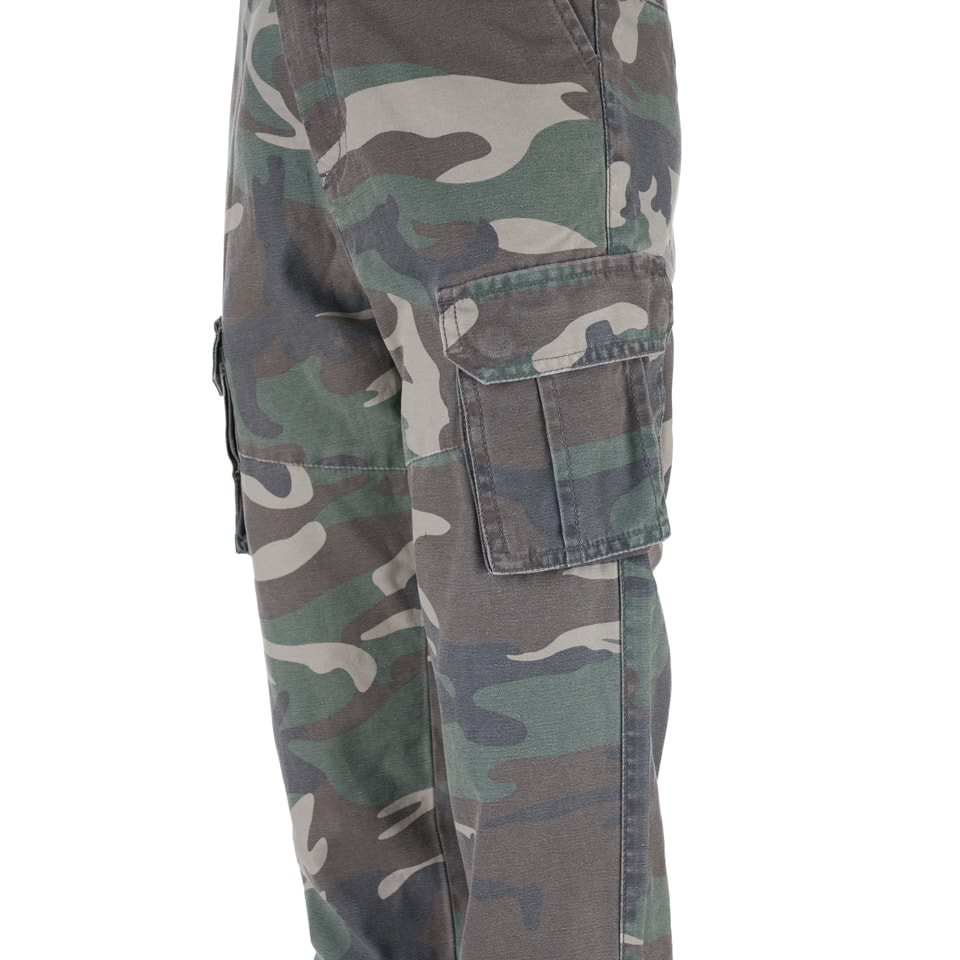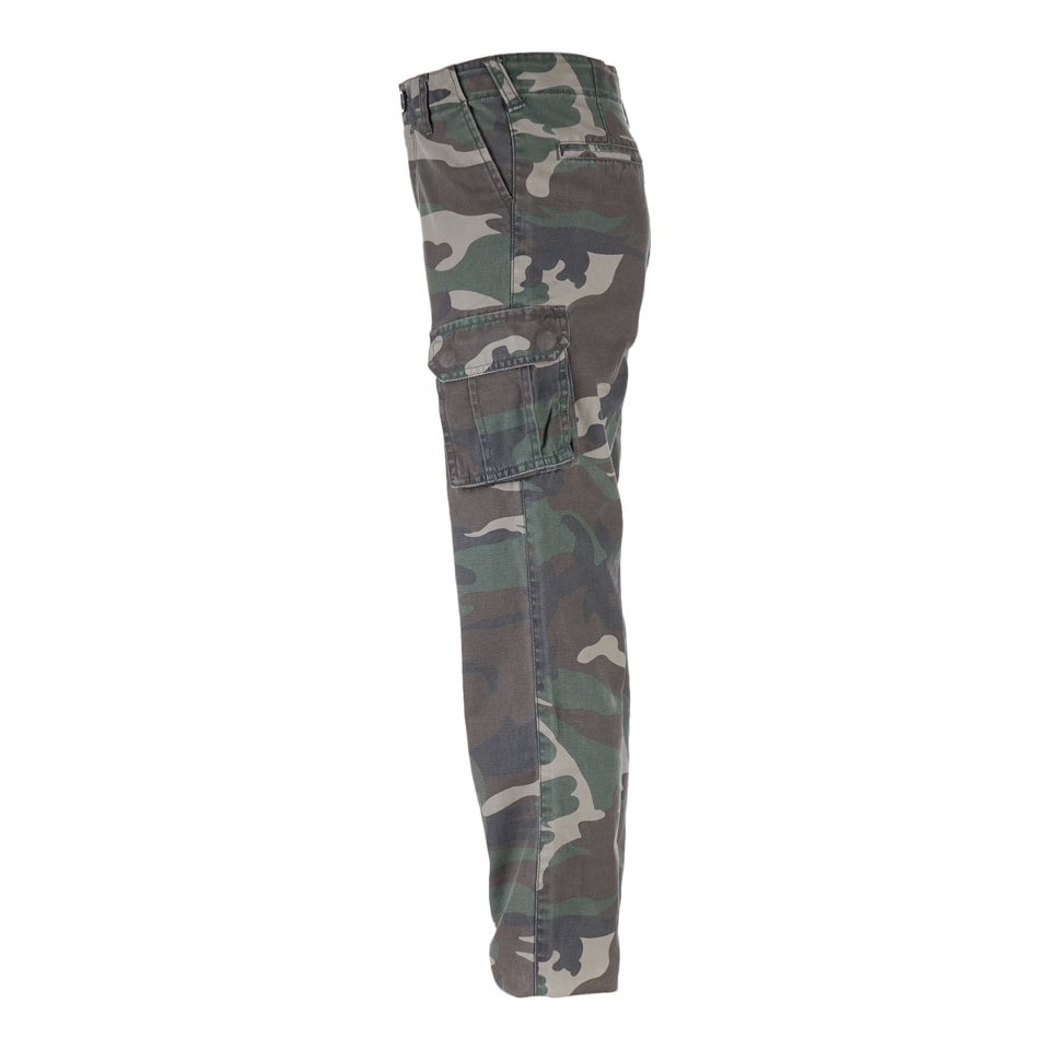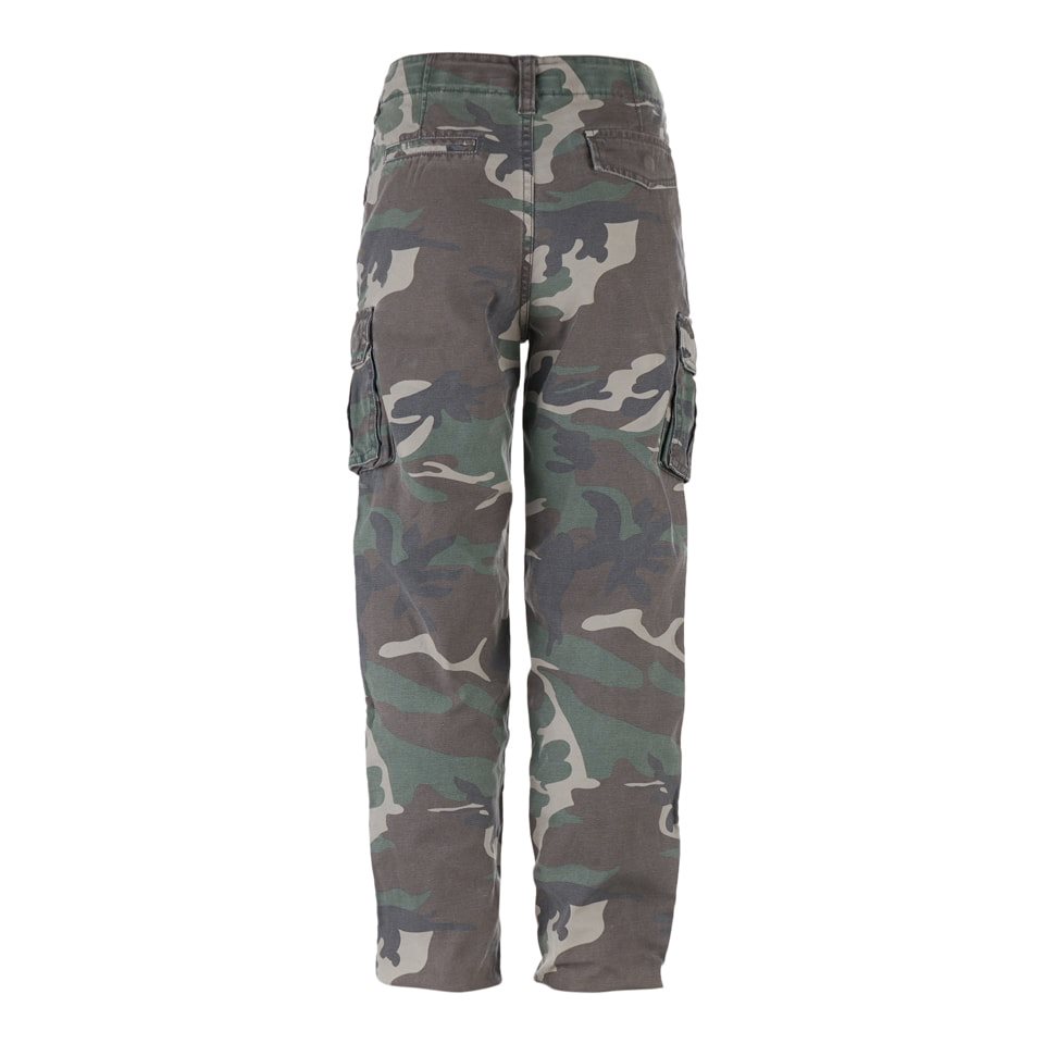 La chiusura dei pantaloni è realizzata con una combinazione di bottone e cerniera metallica. Le tasche hanno aperture oblique. Sulle cosce sono presenti due ampie tasche cargo. L'ultima tasca si trova sul retro dei pantaloni. È piuttosto profonda e coperta da una patta con bottone a pressione.