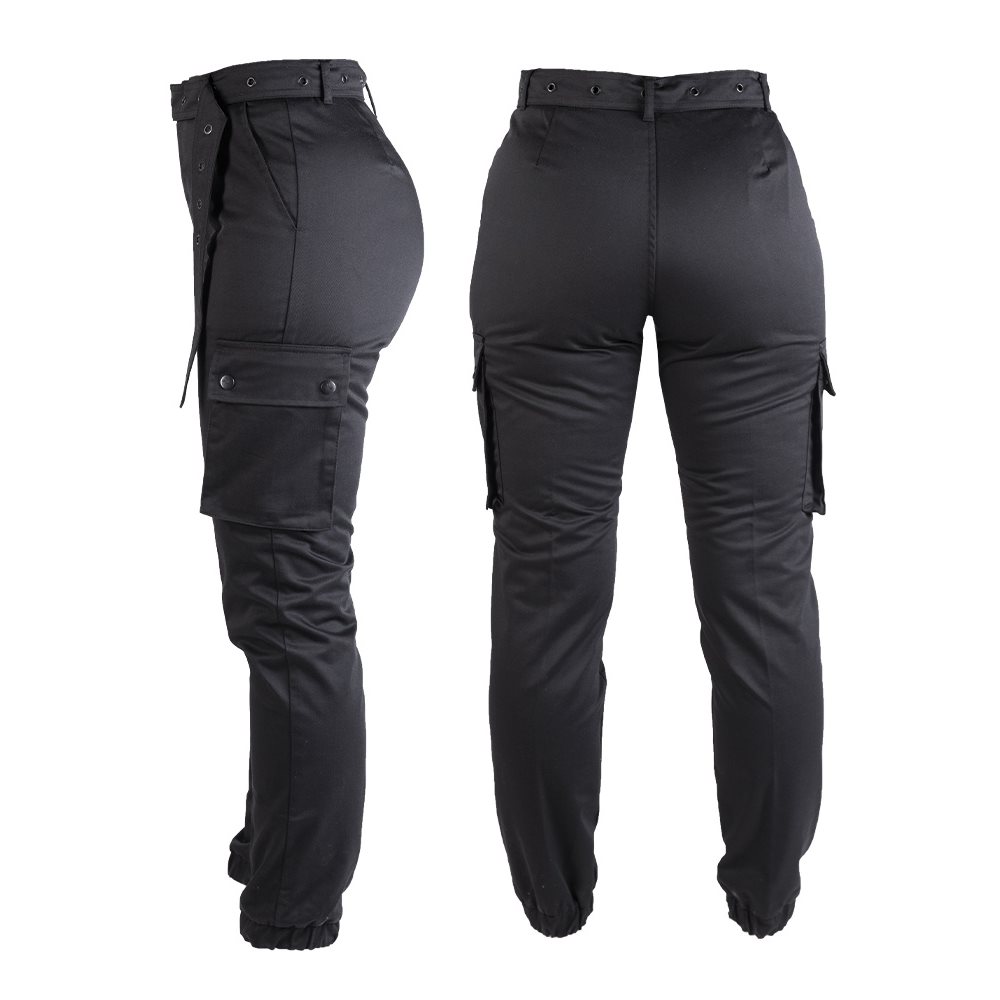 Pantaloni militari da donna eleganti con vita alta. Per riporre gli accessori sui pantaloni sono disponibili quattro tasche. Due classiche sulle mani con apertura obliqua e due tasche cargo sulle cosce coperte da patta con bottoni automatici. Le gambe dei pantaloni sono rifinite con un bordo elastico. I pantaloni sono forniti con cintura.