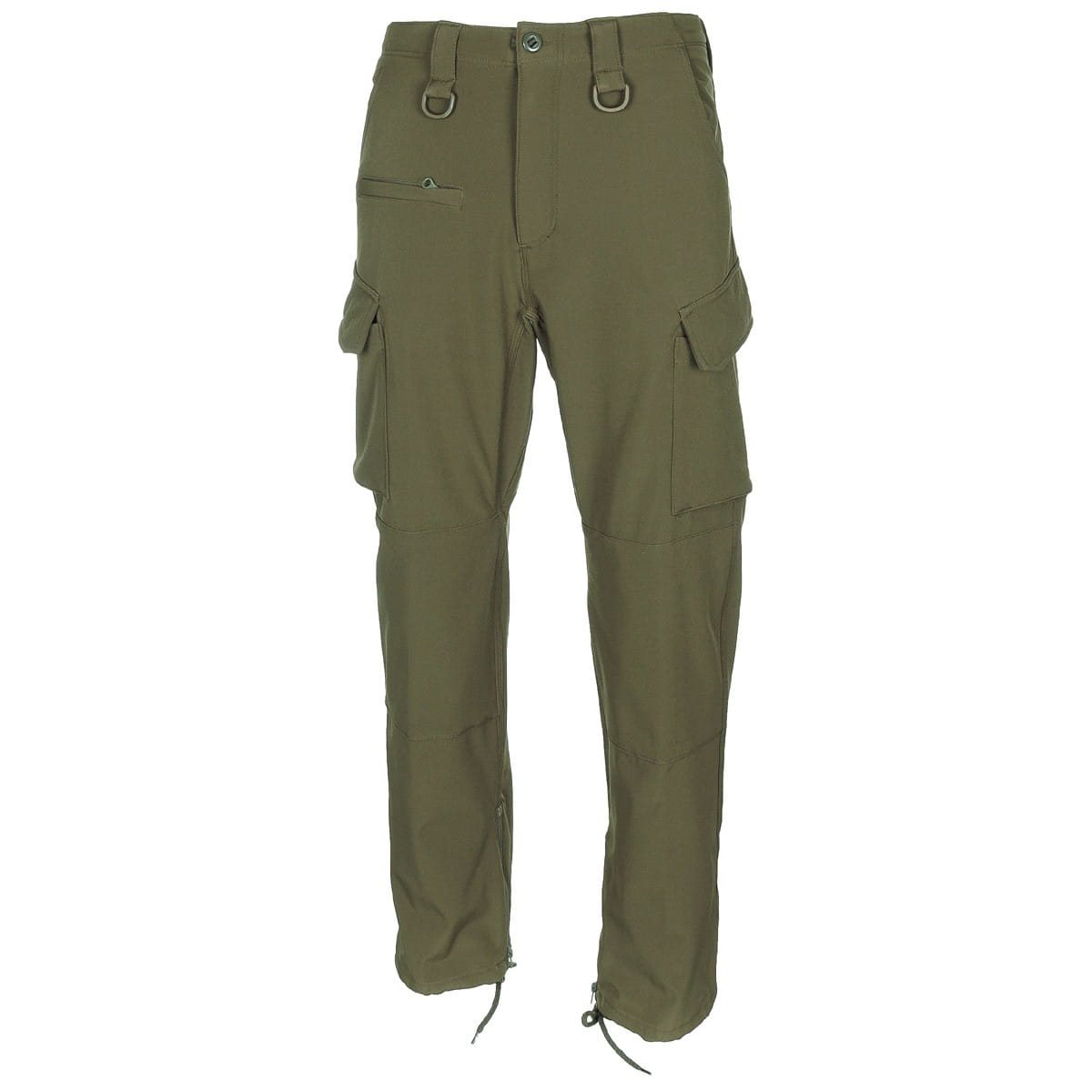 La chiusura dei pantaloni è classica, con bottone e cerniera metallica. I passanti per la cintura sono extra larghi (5,5 cm) e nella parte anteriore sono dotati di anelli a D in plastica. Le tasche in vita hanno aperture oblique e offrono spazio sufficiente per riporre piccoli oggetti. Le due tasche cargo sulle cosce sono coperte da patte con bottoni a pressione. Anche le due tasche posteriori sono coperte allo stesso modo. L'ultima tasca si trova sulla coscia destra ed è chiusa da una cerniera sottile. La struttura dei pantaloni è rinforzata nella zona intorno alle gambe con un doppio strato di tessuto. Il fondo delle gambe può essere stretto con dei lacci.