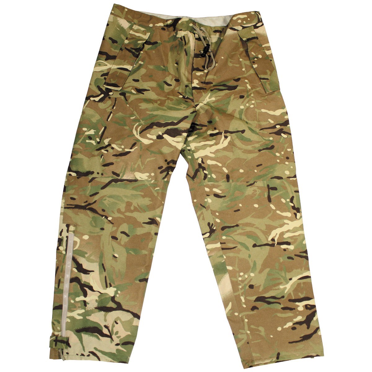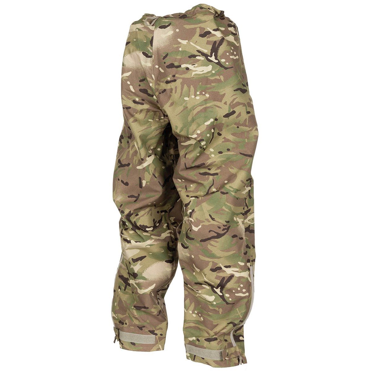 Pantaloni originali MVP (Moisture Vapor Permeable) con stampa MTP (Multi Terrain Pattern) dell'esercito del Regno Unito. Resistenti al vento e impermeabili grazie alla membrana traspirante che consente la fuoriuscita dell'umidità corporea. Progettati come soprabito da indossare sopra l'uniforme standard in condizioni climatiche avverse. Usati.