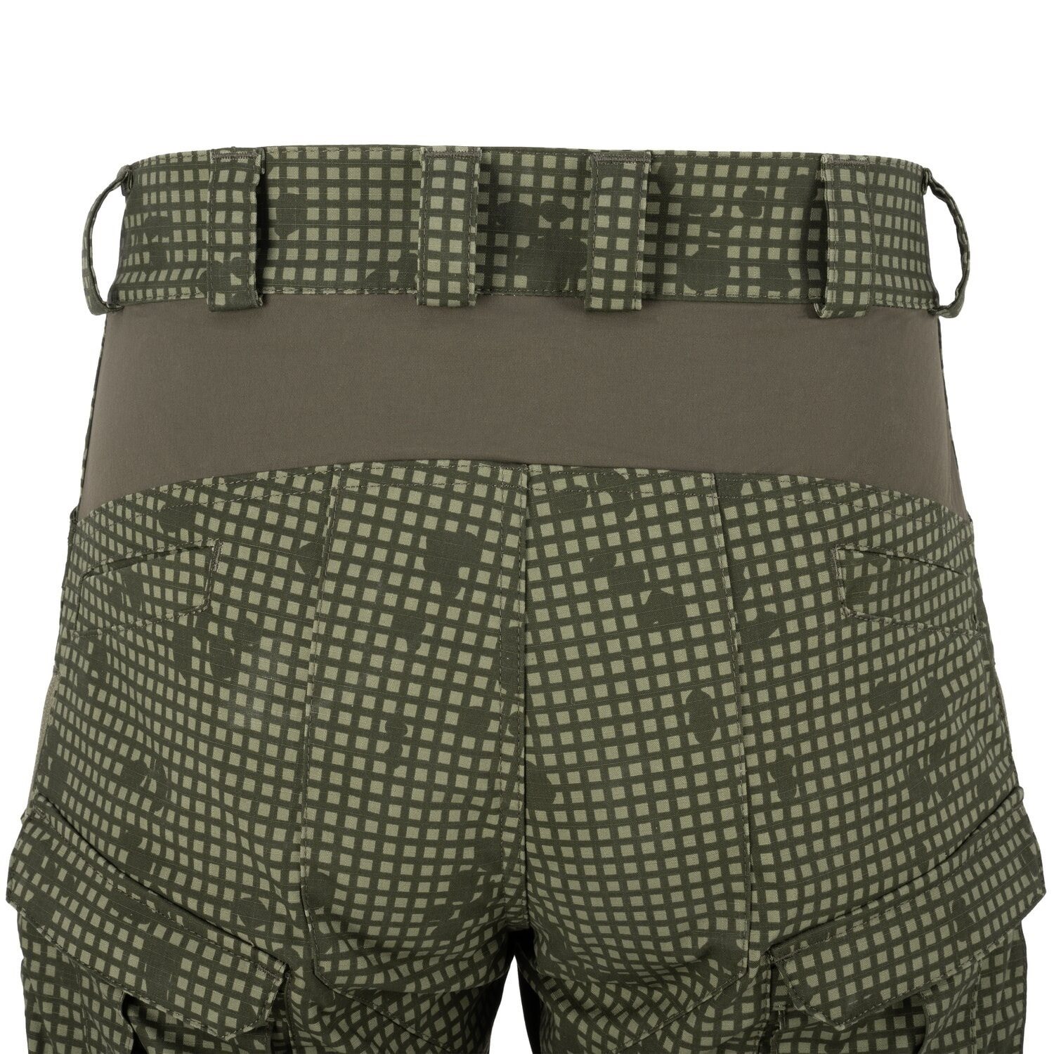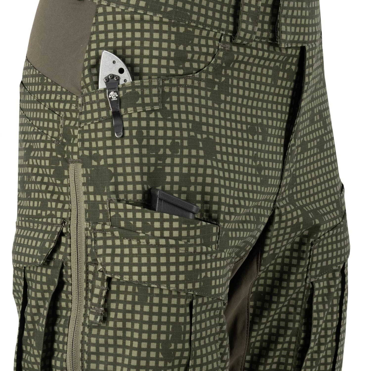 La chiusura dei pantaloni è realizzata con una combinazione di velcro e classica cerniera metallica. I passanti in vita sono sufficientemente larghi per cinture fino a 40 mm di larghezza. Le tasche per le mani sono relativamente capienti e hanno bordi rinforzati che impediscono il danneggiamento quando si portano coltelli in tasca. Le tasche anteriori sulle cosce sono doppie. La coppia "posteriore" è ideale per trasportare caricatori di pistola o piccoli oggetti simili. La coppia "anteriore" di tasche cargo è accessibile tramite una cerniera coperta da una patta e offre un ampio spazio di stivaggio. La seconda coppia di tasche cargo si trova sul retro delle cosce. Lo spazio tra le tasche è occupato da una cerniera che, una volta aperta, rivela una rete destinata a ventilare il calore in eccesso. Le tasche posteriori sui glutei possono contenere facilmente un portafoglio, ma non dispongono di alcuna chiusura di sicurezza. L'ultima coppia di tasche si trova sui polpacci e si chiude con una cerniera verticale.