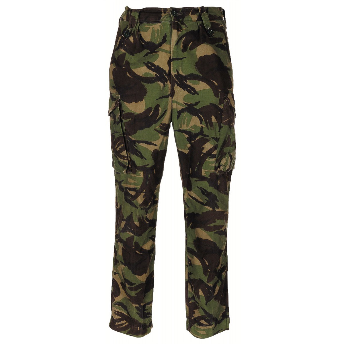 Pantaloni militari britannici di alta qualità e confortevoli in mimetica DPM. Usati. Due tasche laterali per le mani, due grandi tasche sulle cosce con patta e bottoni, patta con bottoni. Materiale: 50% cotone, 50% poliestere.