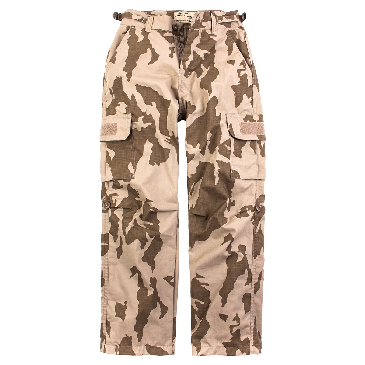 Le due tasche principali oblique sono capienti, ideali per riporre gli oggetti che ogni piccolo soldato deve avere sempre a portata di mano. Sopra le ginocchia si trovano altre due tasche cargo chiudibili con patta e velcro. Un altro velcro si trova sulle patte stesse, dove serve per personalizzare i pantaloni con toppe larghe fino a 7 cm. Le tasche posteriori sono piatte, anch'esse chiudibili con patta in velcro. I pantaloni si chiudono con la classica combinazione di bottone e cerniera e sono regolabili in vita tramite cinturini. I pantaloni possono contenere cinture fino a 40 mm di larghezza. I pantaloni sono dotati di un bottone per fissare le gambe.