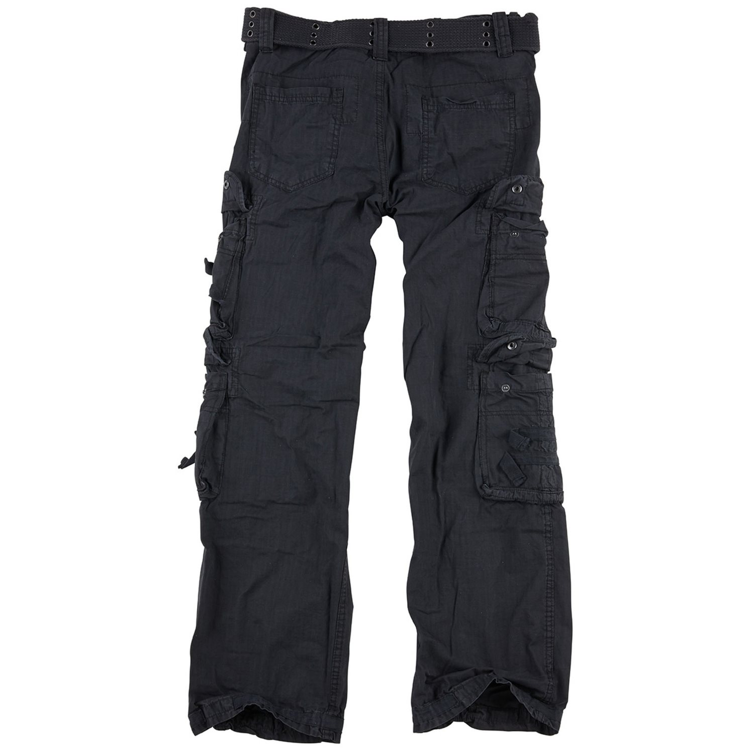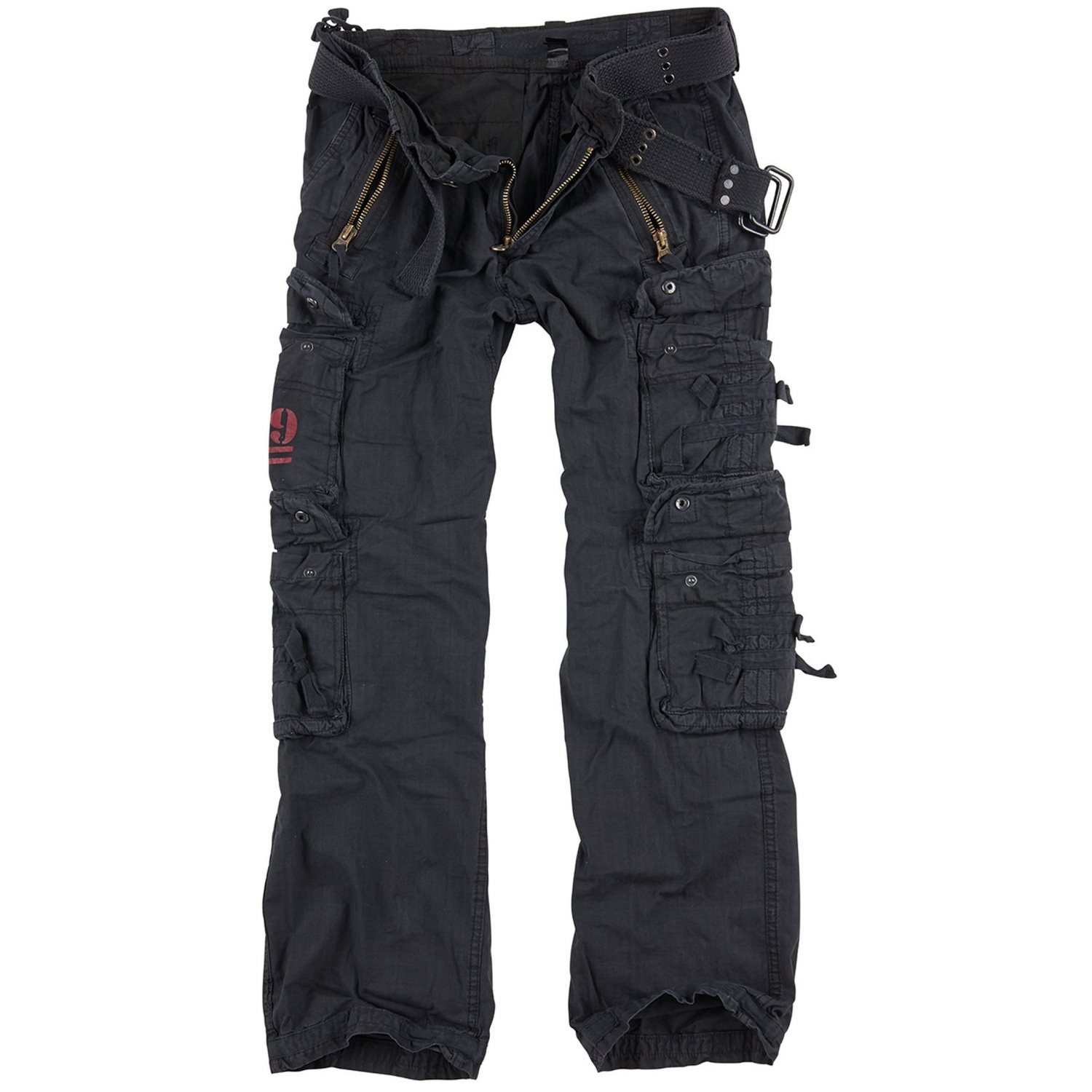 Pantaloni eleganti realizzati in cotone confortevole, ideali per l'uso quotidiano. Si chiudono con la classica combinazione di bottone e cerniera, mentre sui lati in vita è presente una cintura regolabile che consente di adattare la circonferenza della vita. I pantaloni sono inoltre dotati di un'ampia cintura in tessuto con finitura "vintage" (effetto lavato). In vita sono presenti due classiche tasche per le mani, dotate all'esterno di tasche più piccole con chiusura a zip. Nella zona delle cosce si trovano altre quattro tasche capienti, chiudibili con patta e bottoni a pressione. L'ultima coppia di tasche si trova sui glutei. Il bordo inferiore delle gambe è rinforzato con un doppio strato di tessuto per una maggiore resistenza.