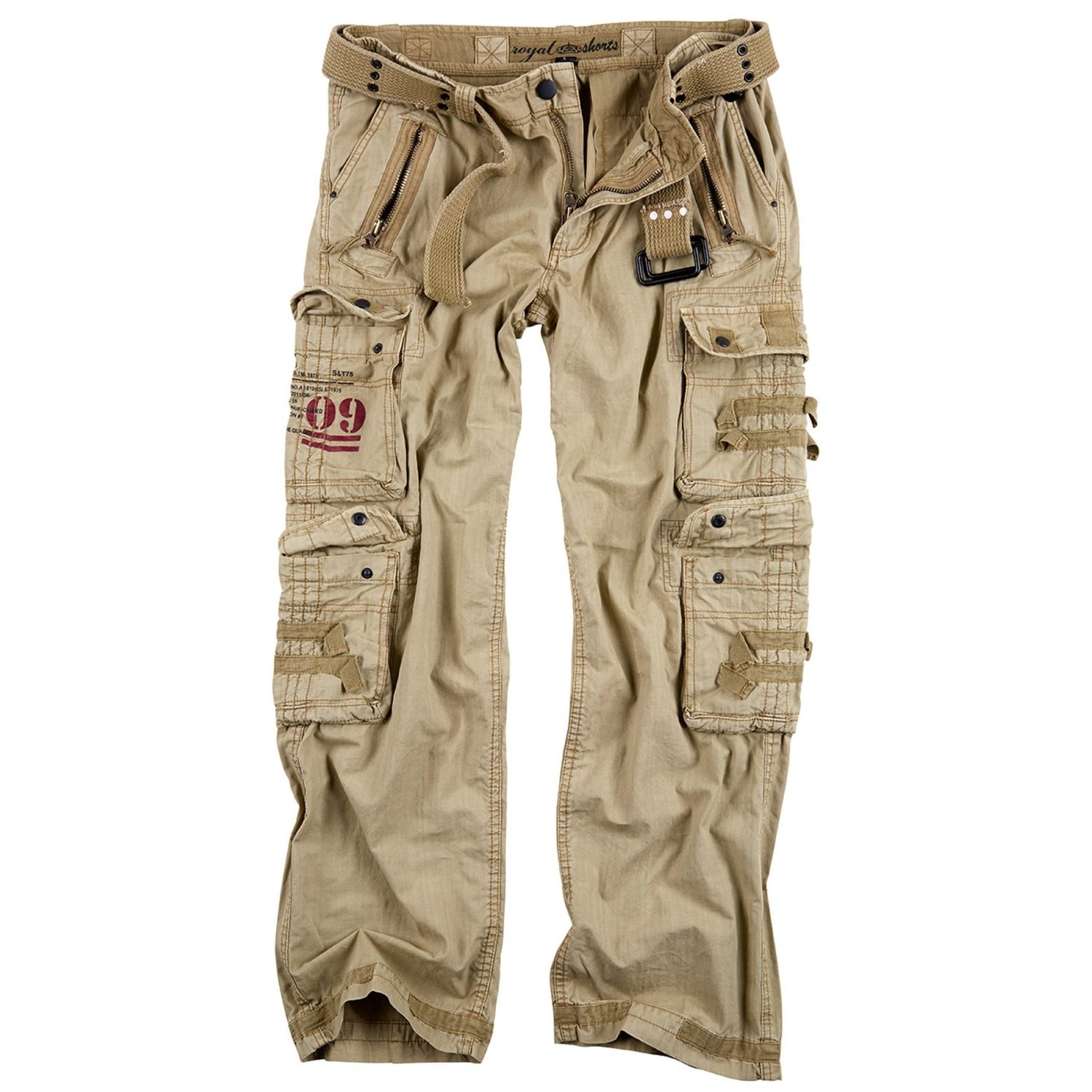 Pantaloni eleganti realizzati in cotone confortevole, ideali per l'uso quotidiano. Si chiudono con la classica combinazione di bottone e cerniera, mentre sui lati in vita è presente una cintura regolabile che consente di adattare la circonferenza della vita. I pantaloni sono inoltre dotati di un'ampia cintura in tessuto con finitura "vintage" (effetto lavato). In vita sono presenti due classiche tasche per le mani, dotate all'esterno di tasche più piccole con chiusura a zip. Nella zona delle cosce si trovano altre quattro tasche capienti, chiuse da patta con bottoni a pressione. L'ultima coppia di tasche si trova sui glutei. Il bordo inferiore delle gambe è rinforzato con un doppio strato di tessuto per una maggiore resistenza.