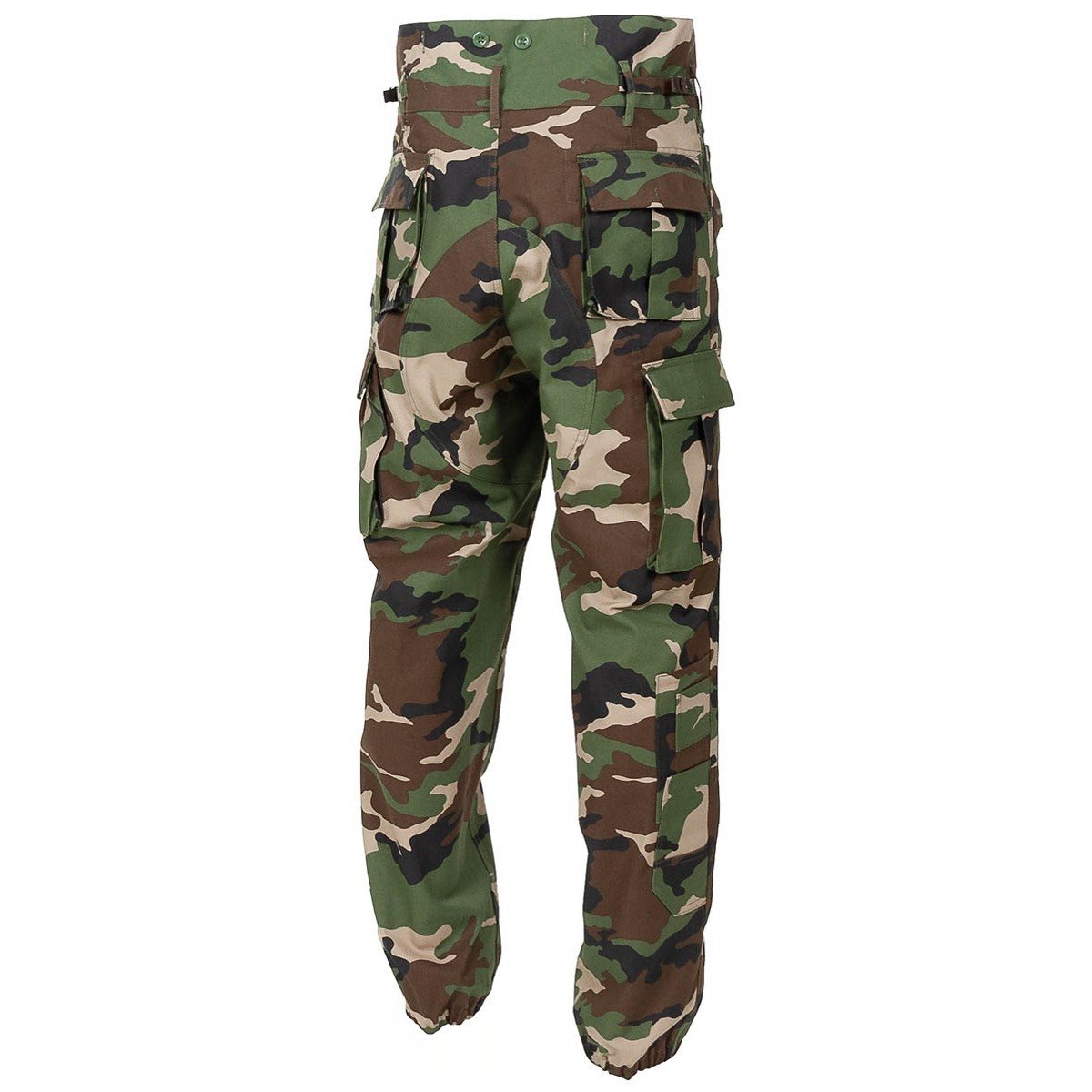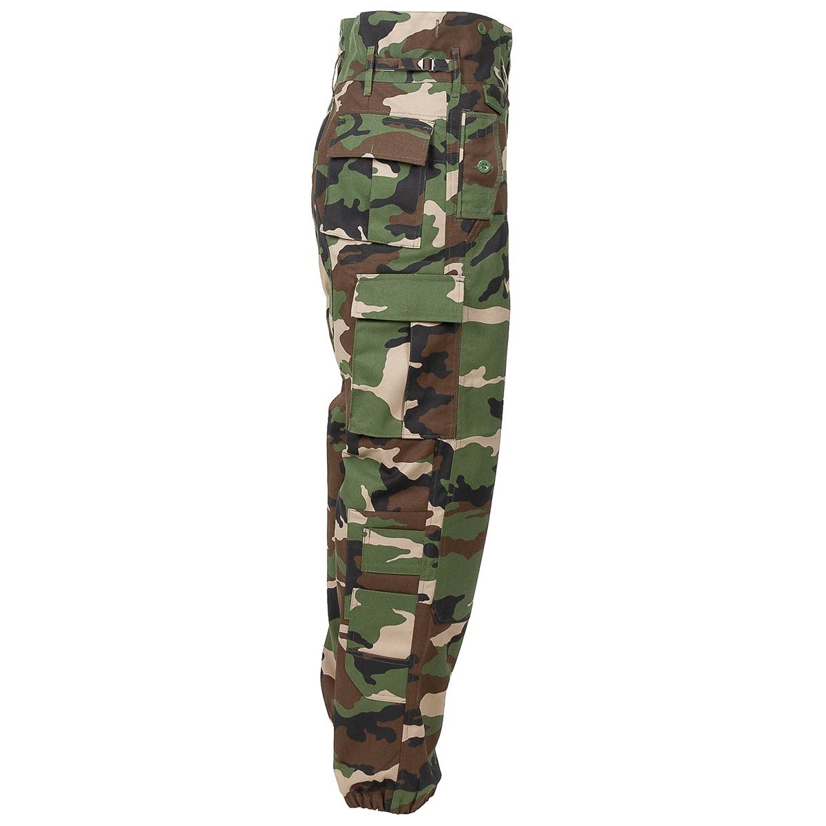Pantaloni realizzati secondo il modello originale delle mimetiche slovacche modello 97. Vita alta con possibilità di ripiegare il risvolto verso l'interno per ottenere una vestibilità classica. Chiusura con bottoni. Numerose tasche per riporre gli oggetti di uso quotidiano. Le tasche sulle braccia sono coperte da un risvolto con bottone per evitare di perdere gli oggetti. I risvolti delle tasche possono essere ripiegati all'interno della tasca, creando così una classica tasca sulla braccia.