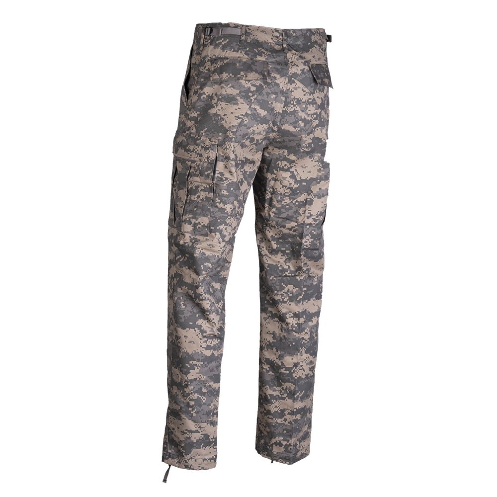 Pantaloni comodi con taglio US BDU (Battel Dress Uniform) in mimetica ACU, attualmente utilizzati dalle unità dell'esercito americano. Ginocchia e seduta rinforzate. Cinghie di regolazione per adattare la taglia in vita. Chiusura con bottoni. Ulteriori informazioni