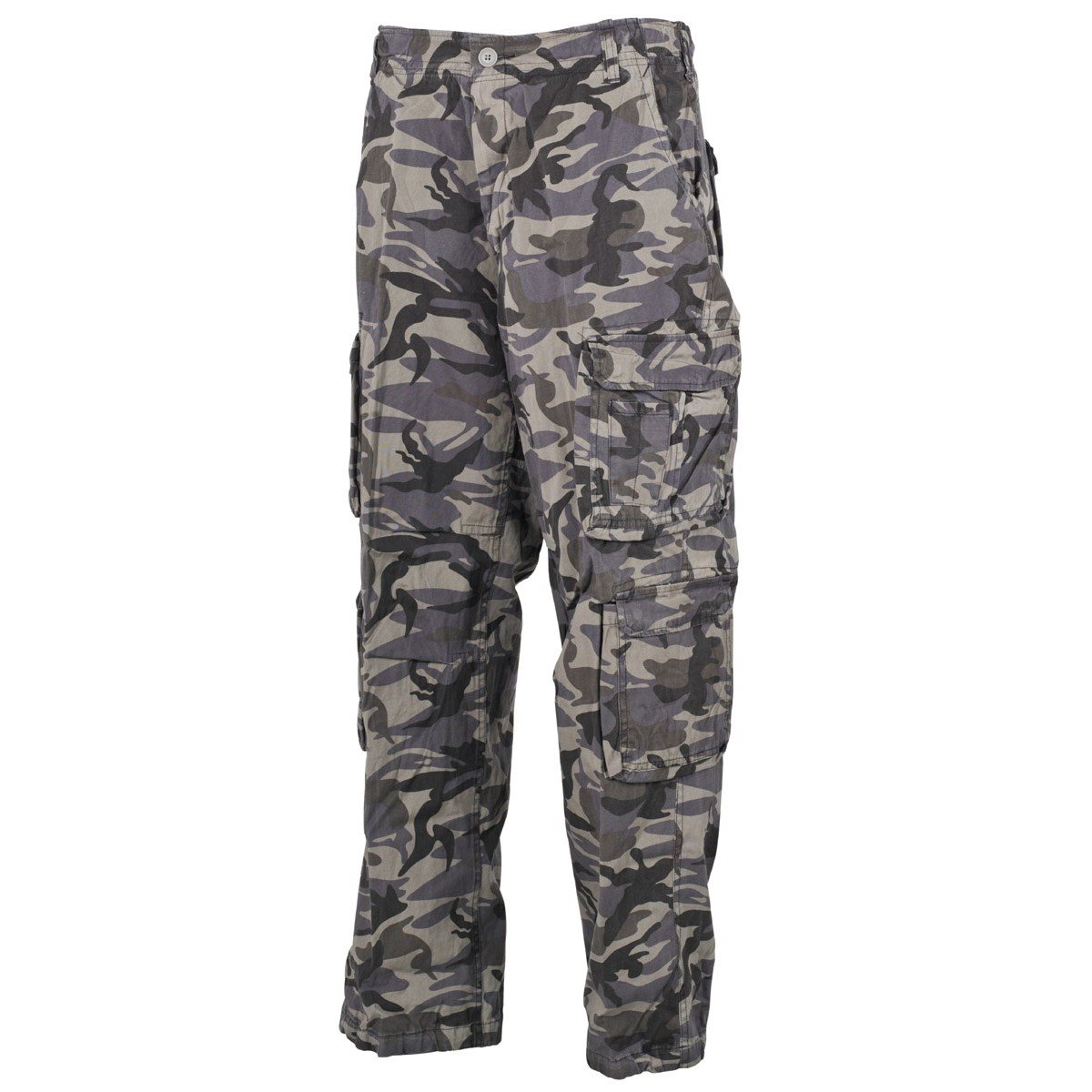 Pantaloni di alta qualità in stile VINTAGE slavato. Si chiudono con la classica combinazione di zip e bottone. I pantaloni hanno due tasche anteriori e quattro profonde tasche cargo sulle gambe. L'ultima coppia di tasche si trova nella parte posteriore dei pantaloni. I passanti dei pantaloni possono contenere cinture larghe fino a 55 mm.