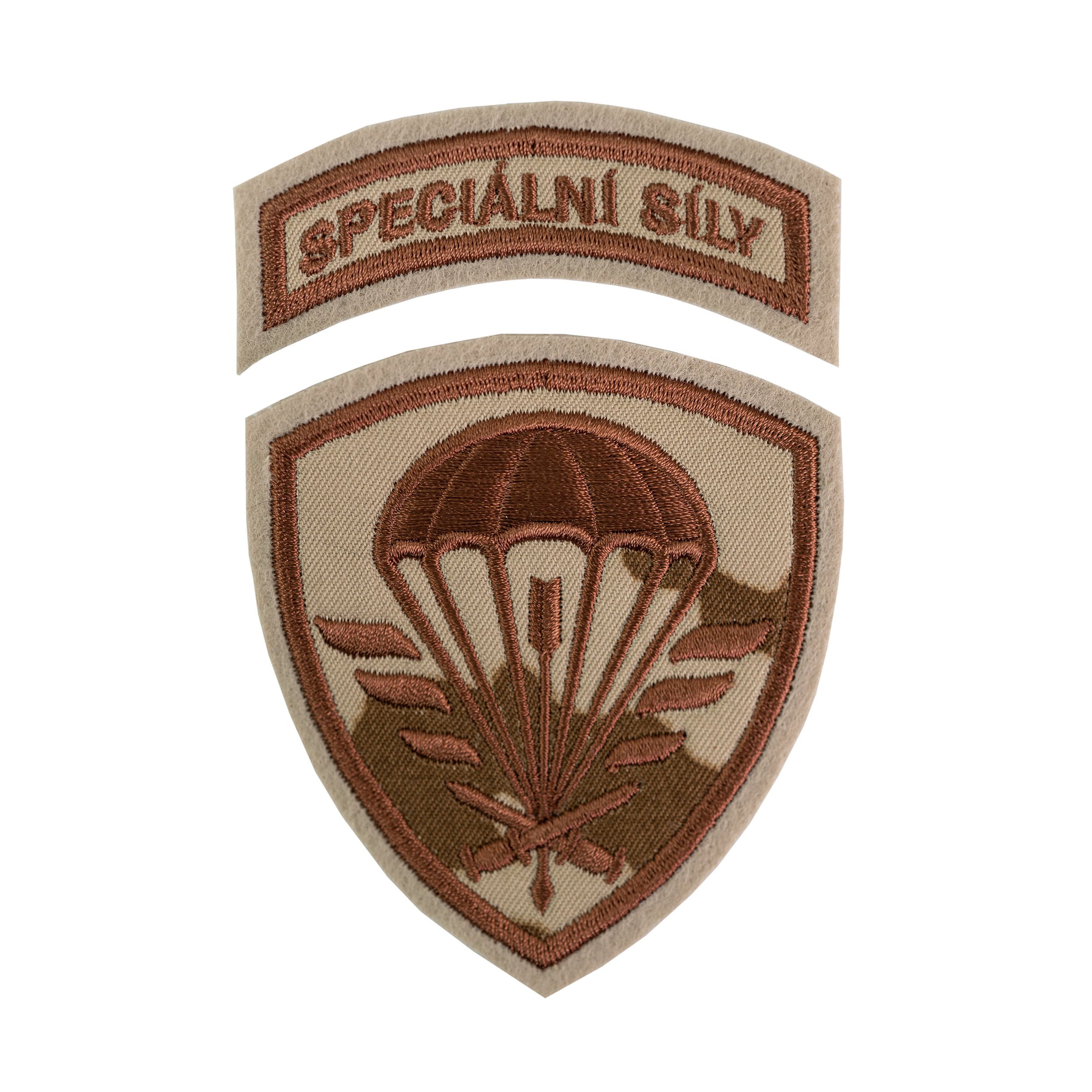 Distintivo in due parti FORZE SPECIALI dell'Esercito della Repubblica Ceca. Versione mimetica desertica mod. 95 DESERT. Dimensioni circa 7 x 8 e 7 x 2,5 cm.