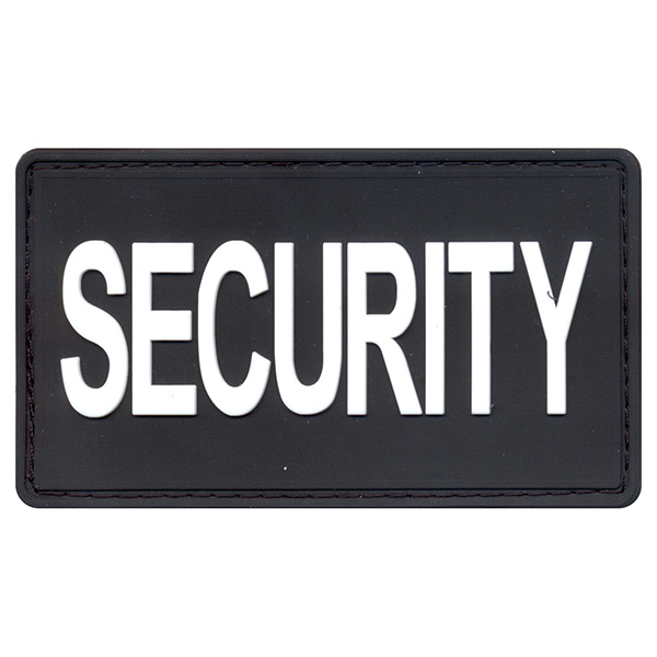Toppa in plastica con chiusura in velcro, con grande scritta bianca SECURITY su sfondo nero, dimensioni 4,7 x 8,5 cm.