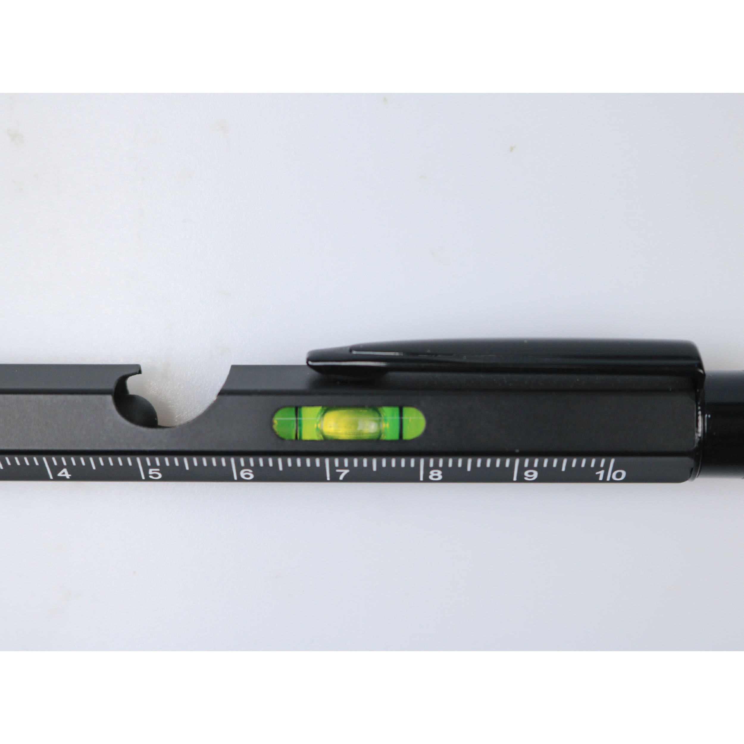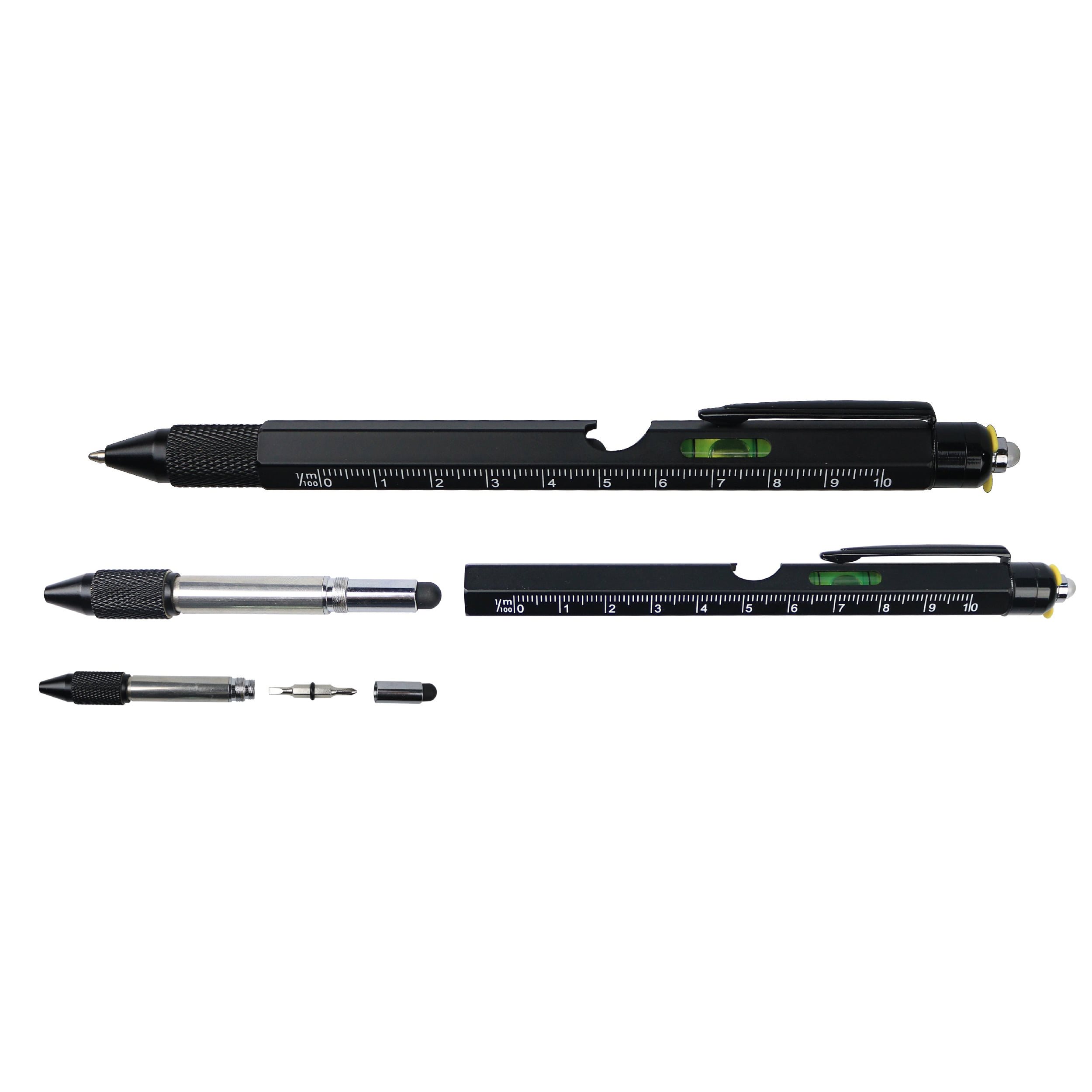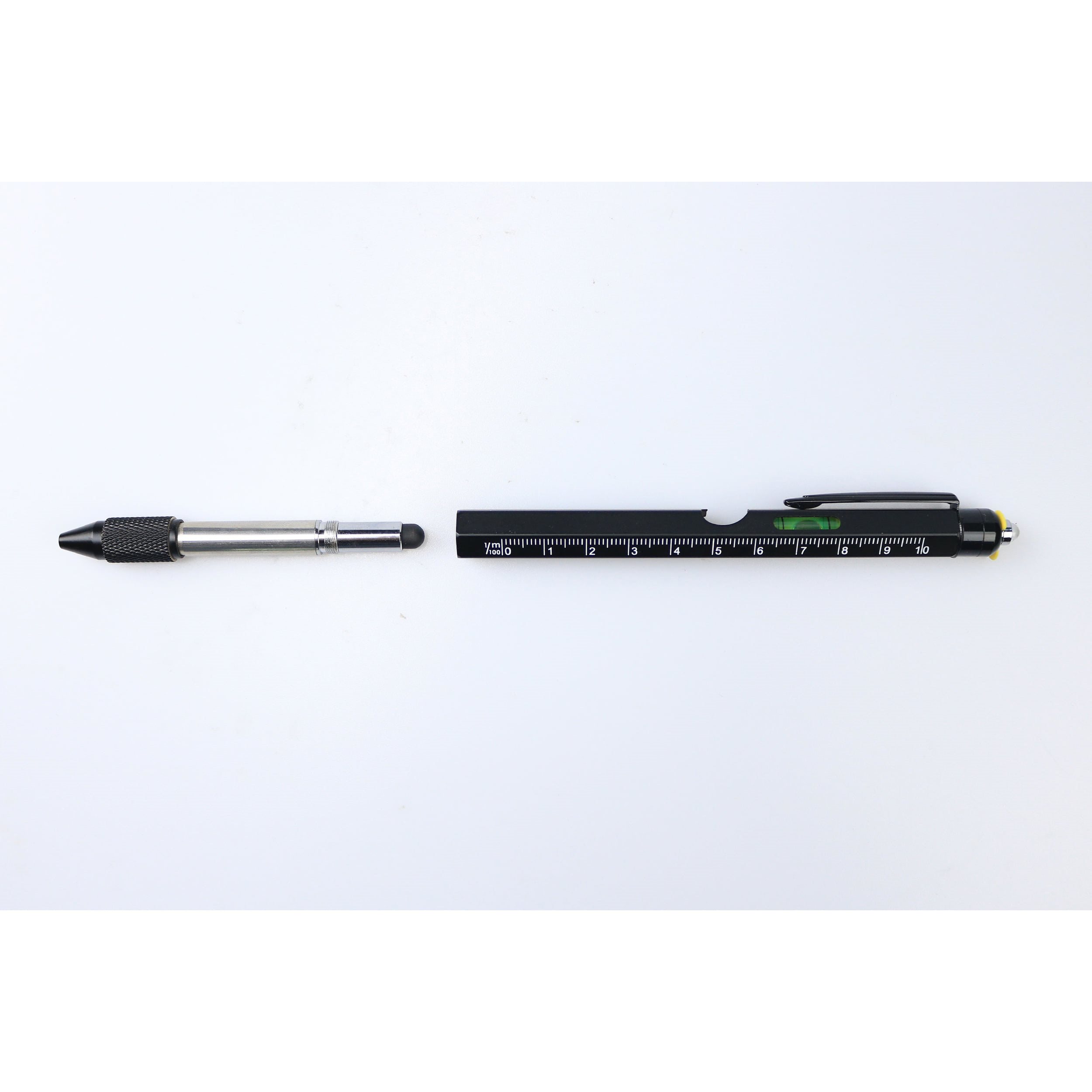 Penna multifunzionale con punta a sfera. La penna può essere utilizzata come stilo per dispositivi smart, cacciavite, righello con livella, supporto per telefono e piccola torcia LED.