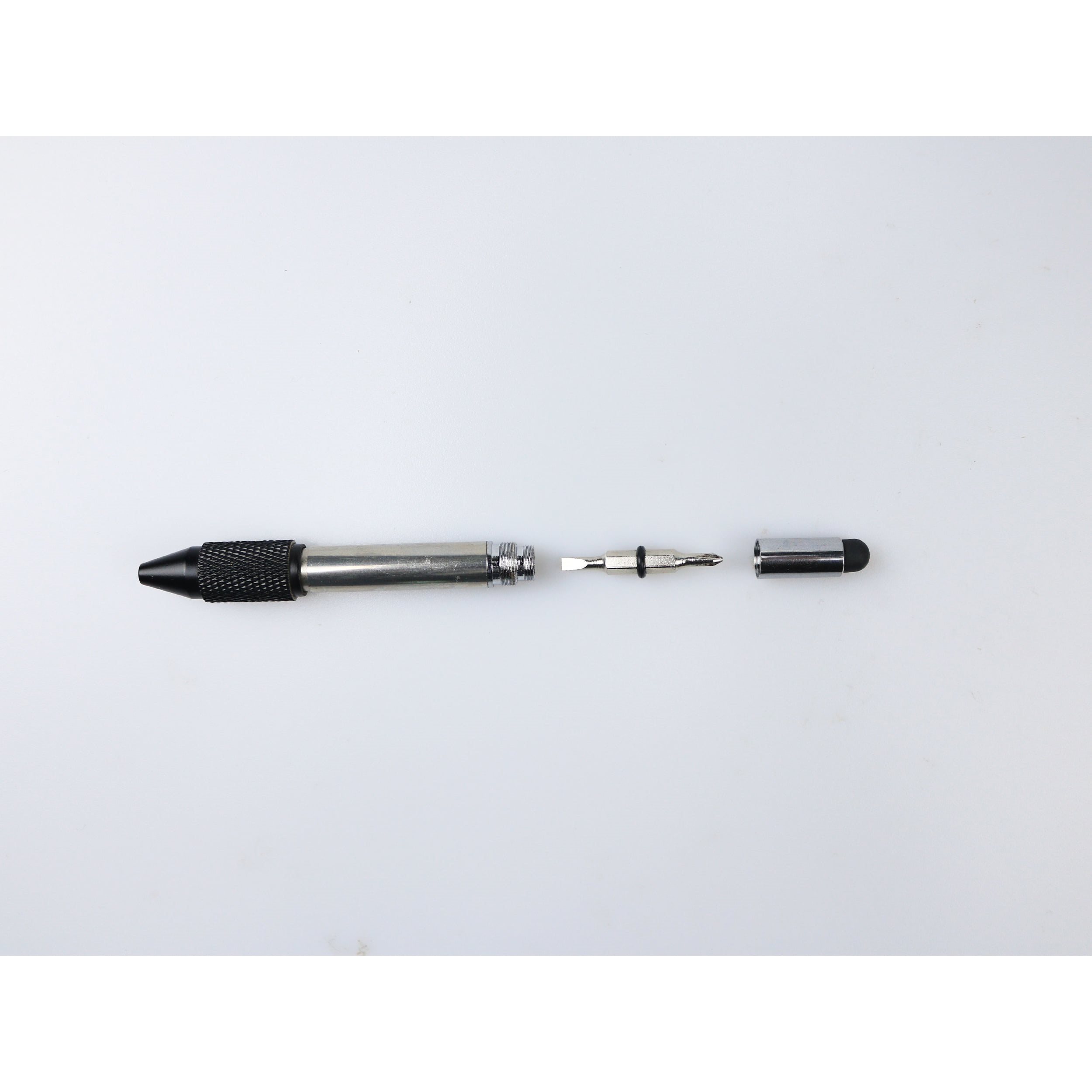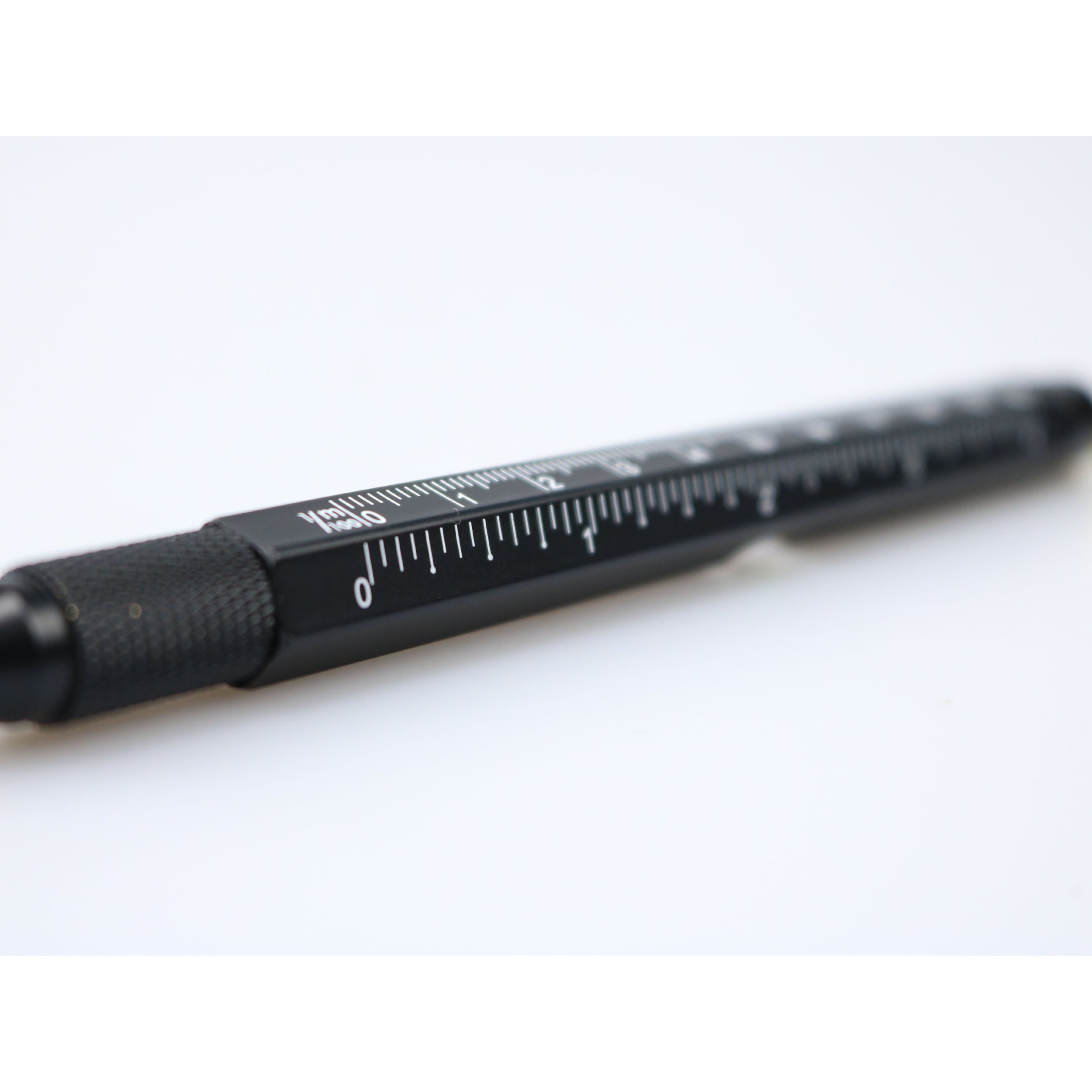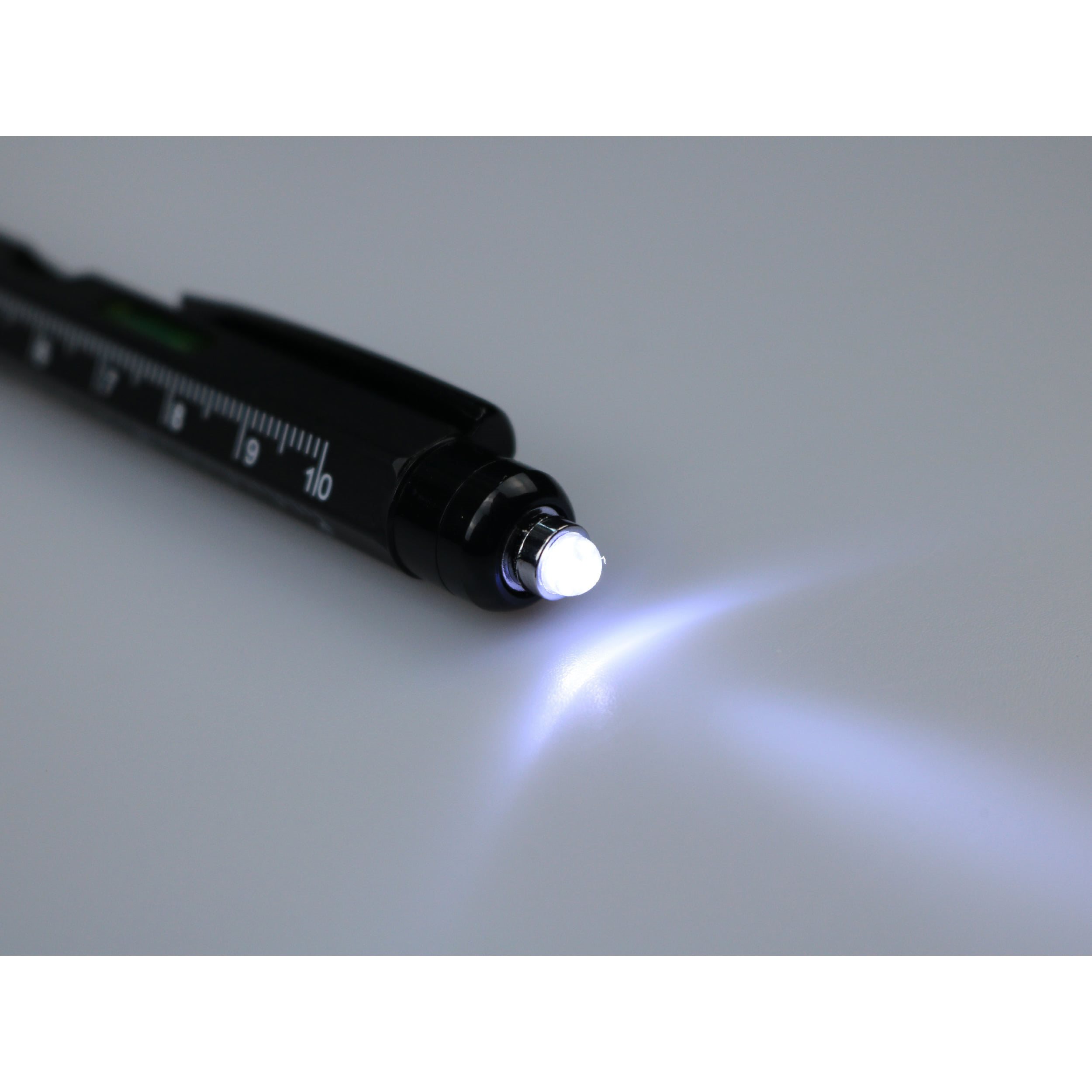 Penna multifunzionale con punta a sfera. La penna può essere utilizzata come stilo per dispositivi smart, cacciavite, righello con livella, supporto per telefono e piccola torcia LED.