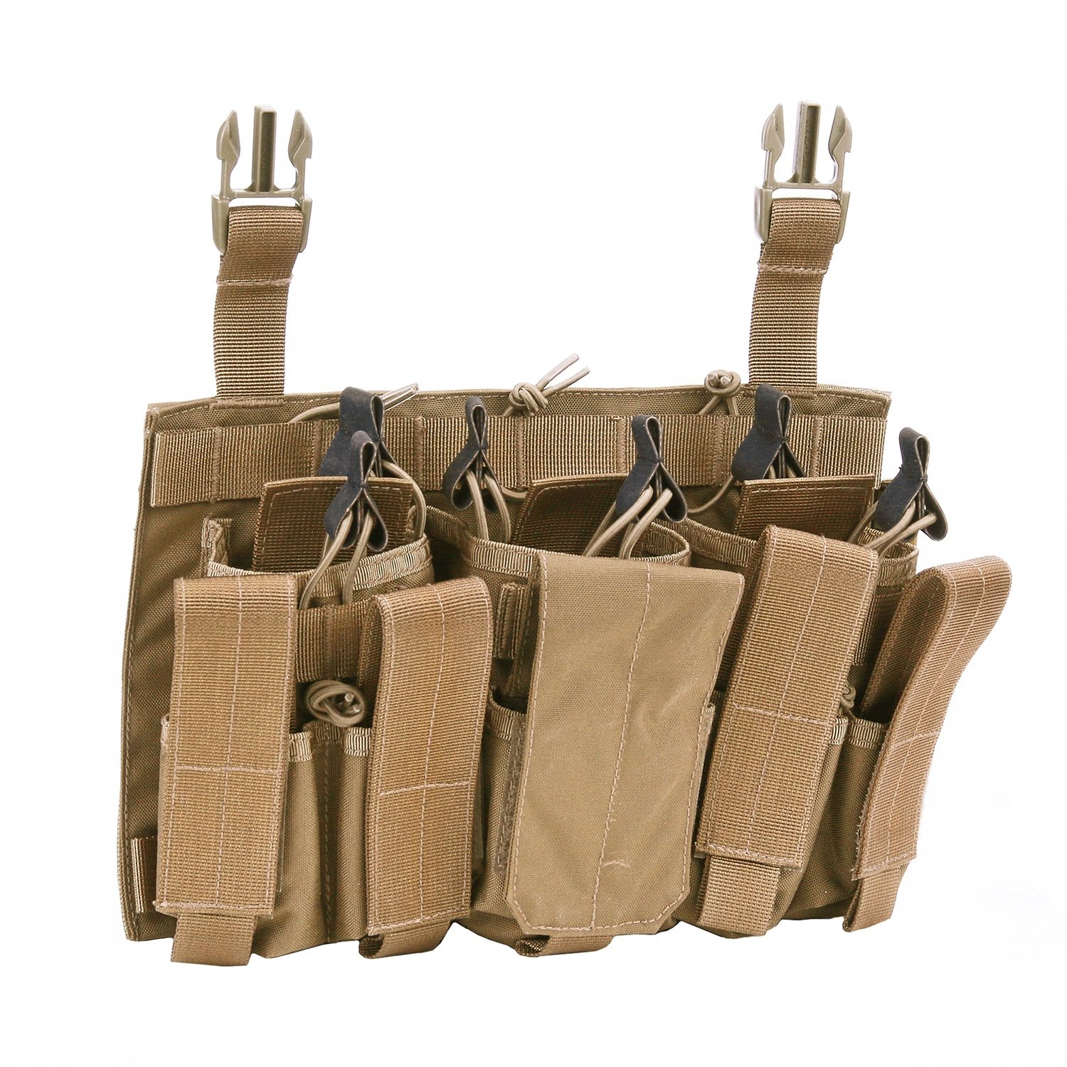 Piattaforma frontale universale, fissata tramite una coppia di fibbie e velcro. La piattaforma è realizzata in resistente Cordura 500D ed è progettata per tre caricatori di tipo M4 e tre caricatori per pistola.