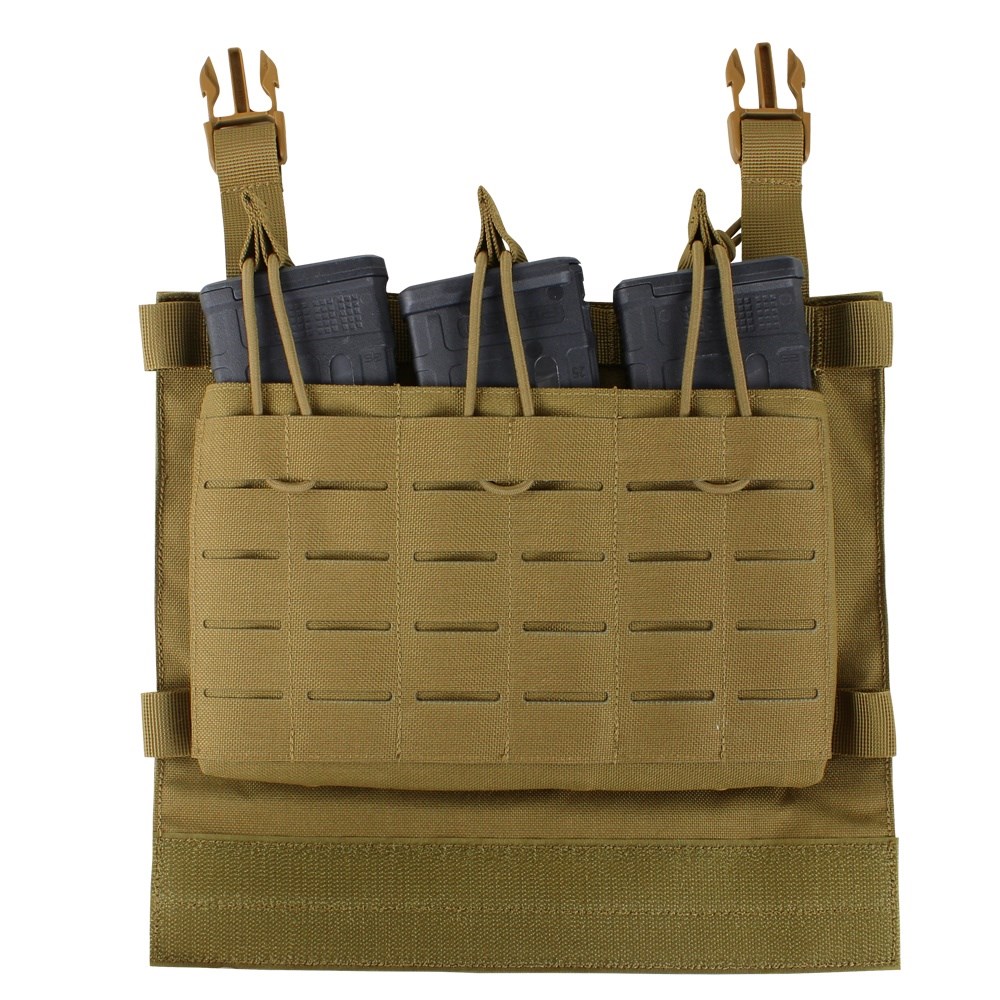Le tasche aperte cucite saldamente con cordino elastico consentono di trasportare tre caricatori di tipo AR15 o AK. È possibile fissare altre tasche grazie al sistema di aggancio modulare PALS / MOLLE inciso al laser sul lato anteriore. Su entrambi i lati della piattaforma sono presenti due passanti in tessuto che possono essere utilizzati per agganciare moschettoni o fissare cordini di sicurezza all'attrezzatura trasportata.
