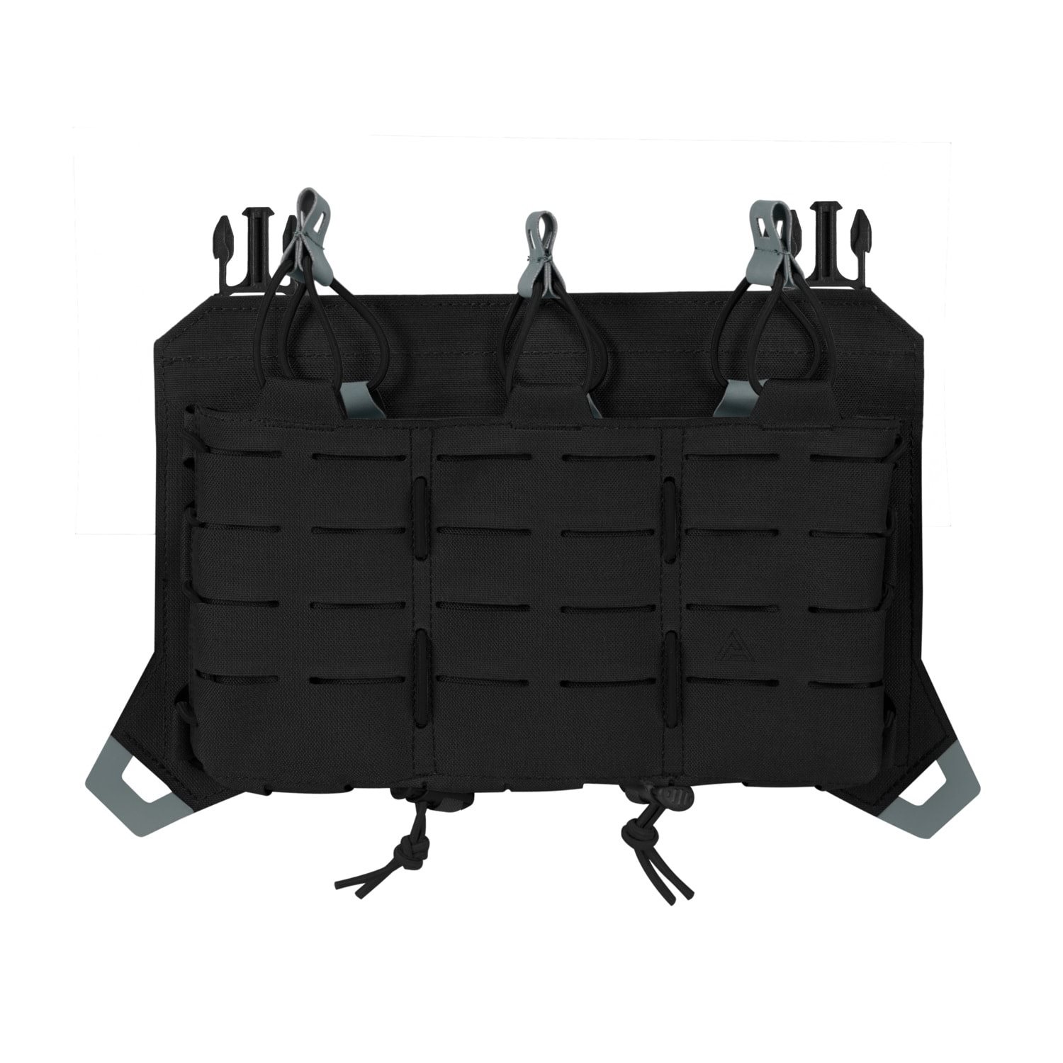 Piattaforma frontale aggiuntiva con tre tasche per caricatori di fucili di tipo AR, AK e SR. Una volta installata sul giubbotto SPITFIRE, la piattaforma sostituisce quella originale. I caricatori sono fissati nelle tasche tramite cordini elastici regolabili con fermacordini. La parte anteriore della piattaforma è ricoperta da un sistema di aggancio MOLLE/PALS inciso al laser per l'installazione di ulteriori accessori compatibili.