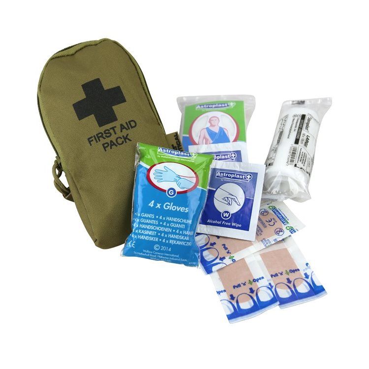 Piccola cassetta di pronto soccorso compatta con stampa mimetica BTP, molto simile al modello britannico MTP. La cassetta di pronto soccorso presenta due passanti elastici sul retro per il fissaggio allo zaino o un passante rigido per il fissaggio alla cintura, ecc. La cassetta di pronto soccorso contiene: