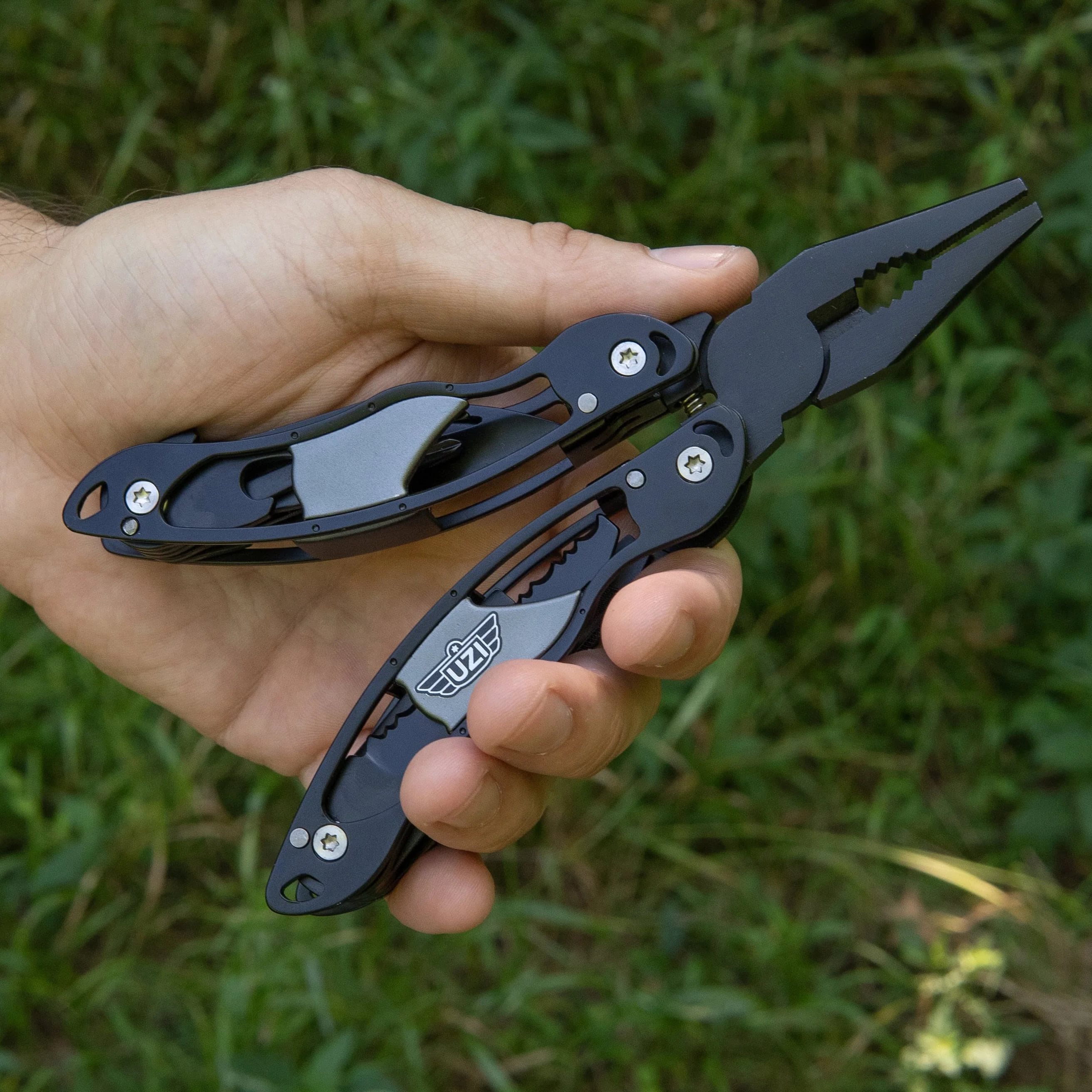 Set di pinze multifunzionali e piccolo utensile multifunzionale del marchio UZI. Sia le pinze che l'utensile sono realizzati in alluminio aeronautico, che offre un ottimo rapporto tra leggerezza e resistenza. Fornito con custodia da cintura.