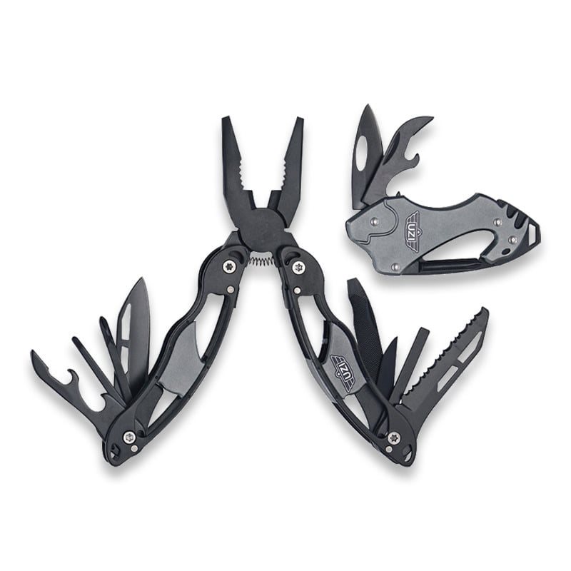 Le pinze sono dotate di molla e sono in gran parte annerite. Sono disponibili: coltello con lama liscia, piccolo cacciavite a croce, piccolo cacciavite piatto, apribottiglie combinato con apriscatole, seghetto, cacciavite medio e lima con cacciavite piatto. Questo strumento multifunzionale è ideale da agganciare alle chiavi e dispone di un coltellino con lama liscia, un apribottiglie e un apriscatole, un piccolo cacciavite piatto e uno a croce.