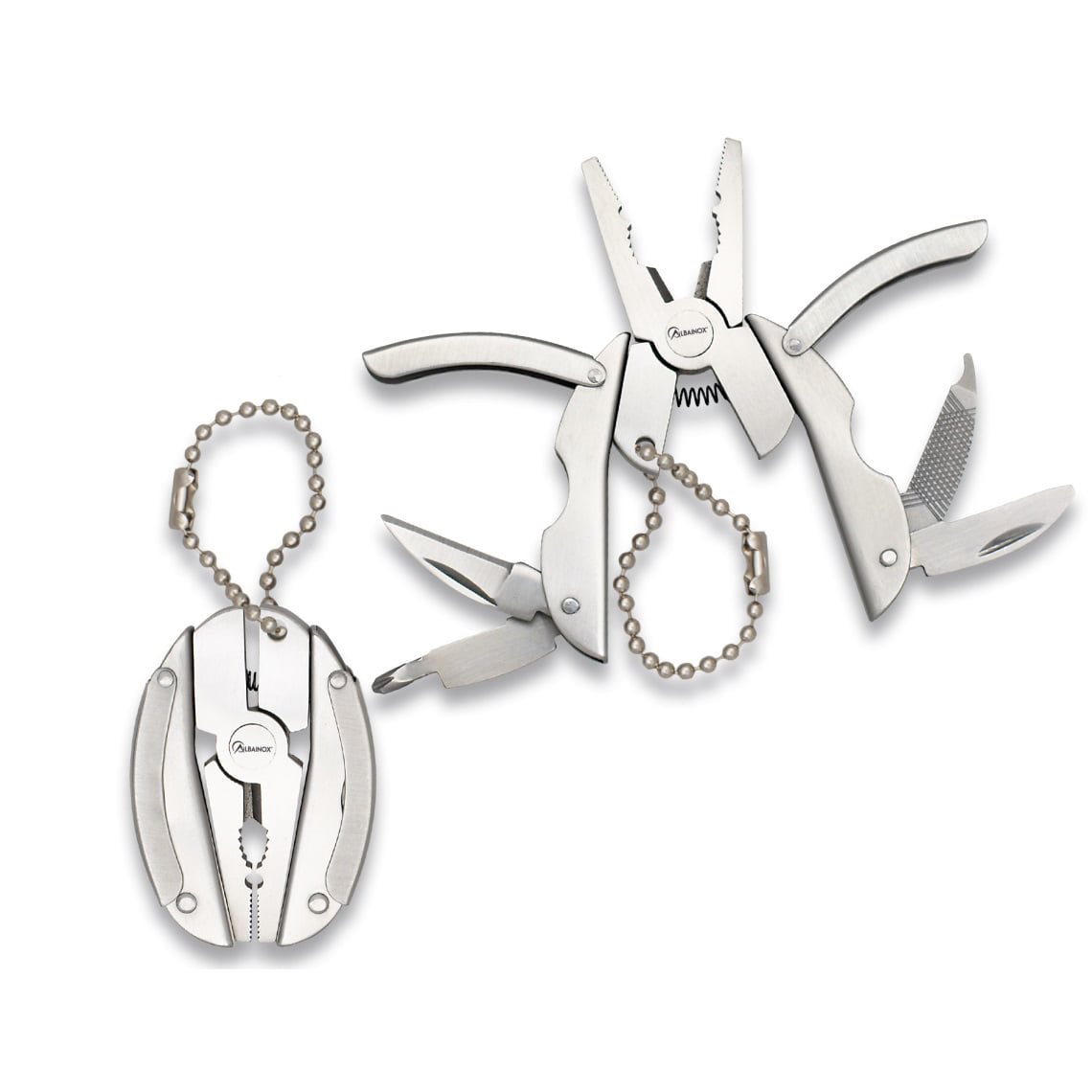 Piccolo strumento multifunzionale che include pinze, 2 coltelli con lama liscia, lima e cacciavite. Lunghezza totale (aperto): 7,5 cm. Materiale: acciaio inossidabile 3Cr13MoV. Peso: 46 g. Ulteriori informazioni