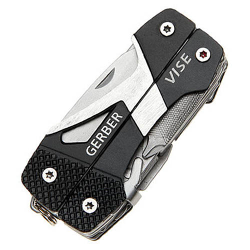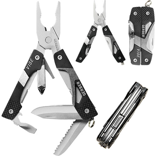 Utensile pieghevole leggero. Pinze con impugnatura in alluminio. Coltello con lama seghettata. Coltello con lama liscia. Cacciavite piatto medio. Cacciavite piatto piccolo. Cacciavite Philips. Apribottiglie. Lima. Anello per aggancio alle chiavi. Ulteriori informazioni