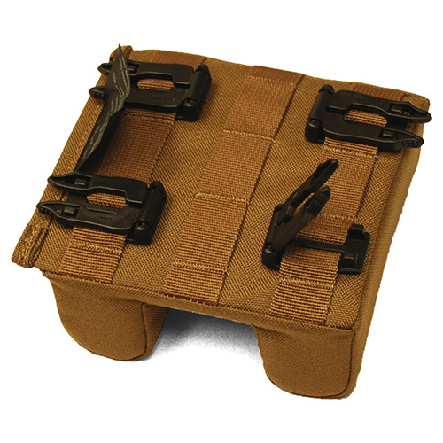 Supporto per sostenere l'arma durante il tiro a lunga distanza. Può essere fissato a zaini o altre piattaforme con attacchi PALS/MOLLE tramite quattro clip in plastica con possibilità di sgancio rapido e riposizionamento. Quando è completamente fissato, occupa lo spazio di tre colonne x tre file di aggancio. La forma con scanalatura centrale fissa bene l'astina dell'arma. Imbottitura leggera in schiuma.